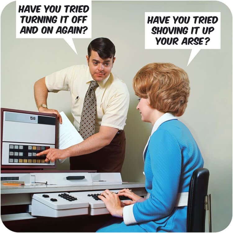 A retro-style coaster with a photo of a man and woman at an office computer, where the man is pointing to the computer with a speech bubble saying ‘Have you tried turning it off and on again?’ and the woman sitting at the desk with a speech bubble saying ‘Have you tried shoving it up your arse?’.