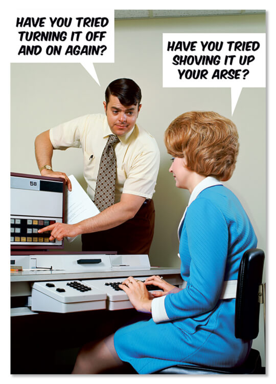 A retro '80's' style picture postcard of an office scene, with a woman at a computer and a man leaning over saying 'Have you tried turning it off and on again?' and the woman replying 'Have you tried shoving it up your arse?' in speech bubbles.