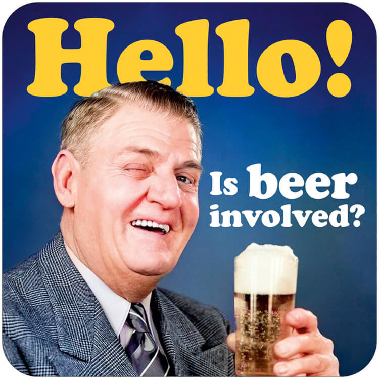 A coaster with a retro picture of a smiling older man side on looking to camera holding a pint of beer. Bold yellow and white text above reads Hello! Is beer involved?