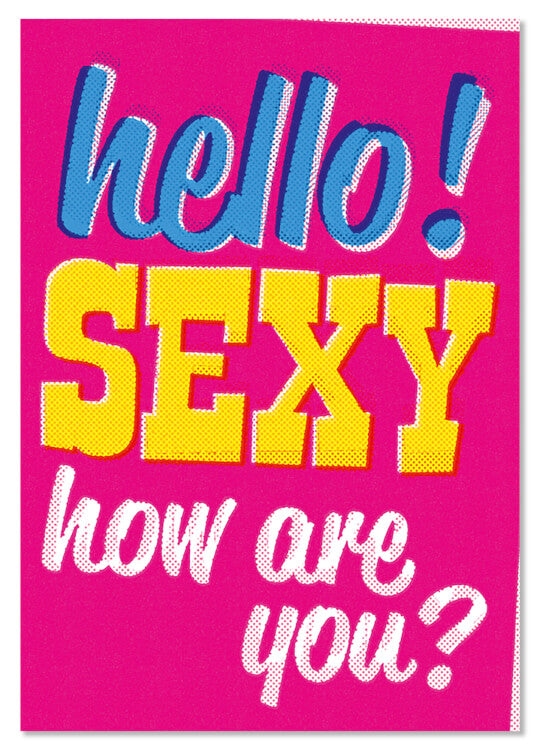 Maybe you've been pussyfooting around too long? In that case, we may have the answer - perhaps. A bright pink postcard for the more forward amongst you, with the words 'Hello! Sexy How are you?' in bold blue, yellow and white magazine print style.