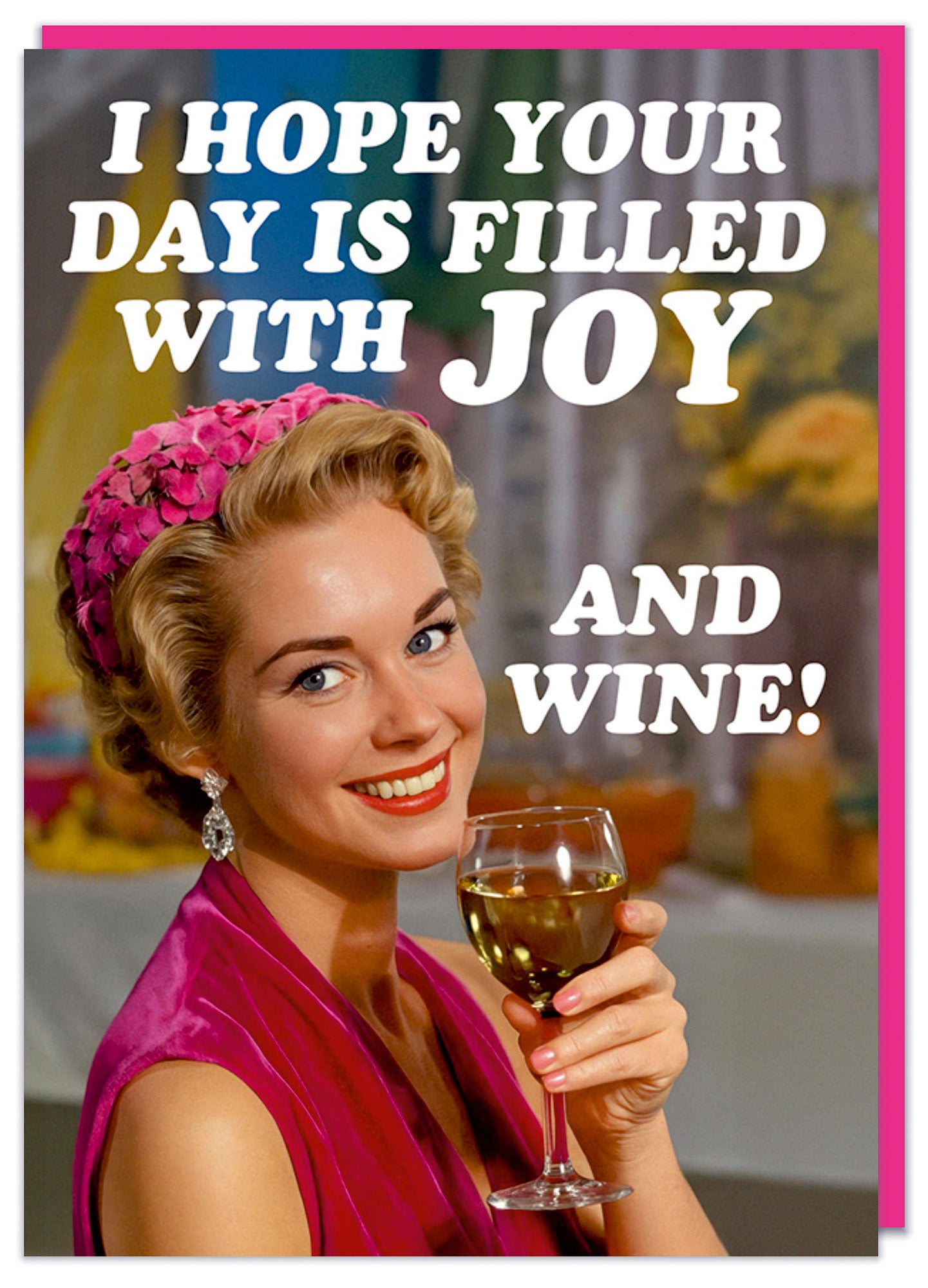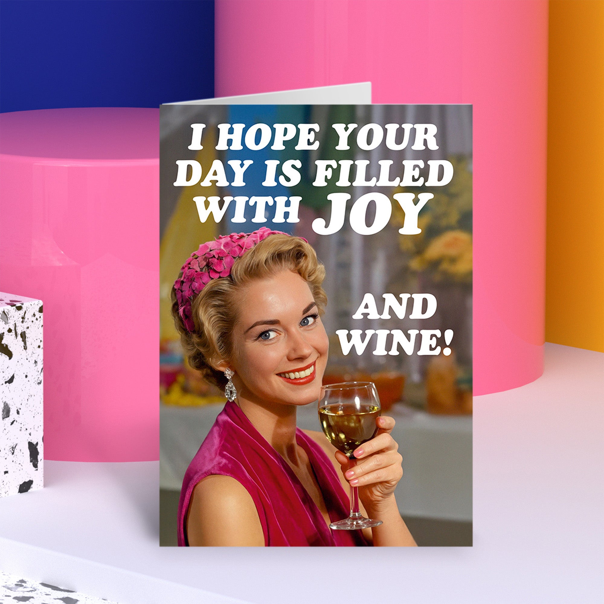 A funny birthday card featuring a vintage-style photograph of a smiling woman wearing a pink sleeveless dress and a matching pink headpiece. She is holding a glass of white wine and looking toward the viewer. The background appears to be an indoor setting with softly blurred colorful elements. Large rounded white text at the top reads “I hope your day is filled with joy” and additional white text to the right reads “and wine!”