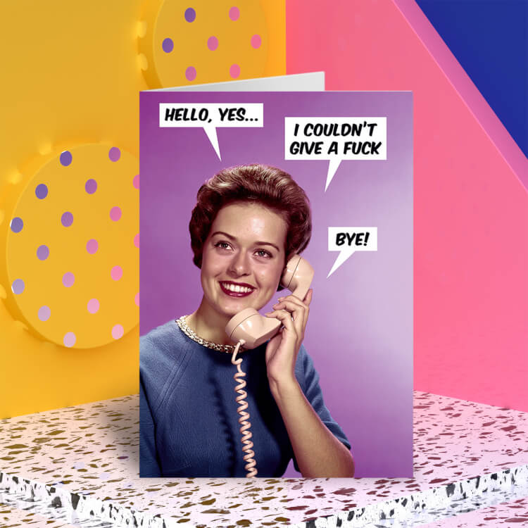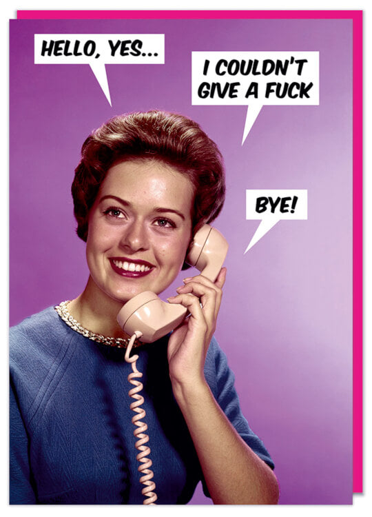 A birthday card with a 1960s picture of a smiling woman in a blue sweater talking on the phone. She is saying Hello, yes... I couldn't give a fuck. Bye!
