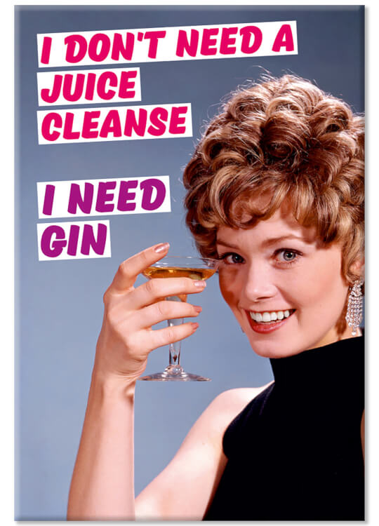 A fridge magnet featuring a 1980’s style picture of a young lady dressed in a black party dress, holding up a drink and smiling at camera. It has the caption ‘I Don't Need a Juice Cleanse I need gin’ written in bold italic capital pink and purple words on white banners.