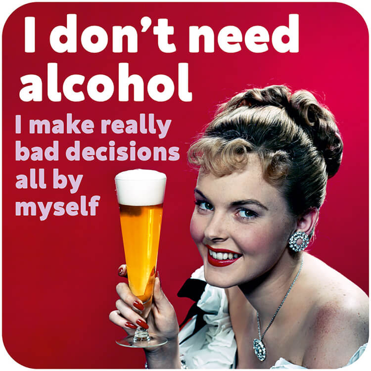 A coaster with a retro photo of a 1950's woman holding a beer glass. Above her simple text reads I don't need alcohol. I make really bad decisions all by myself.