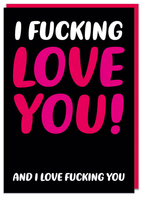A black Valentines card with white and pink text that reads I fucking love you and i love fucking you.