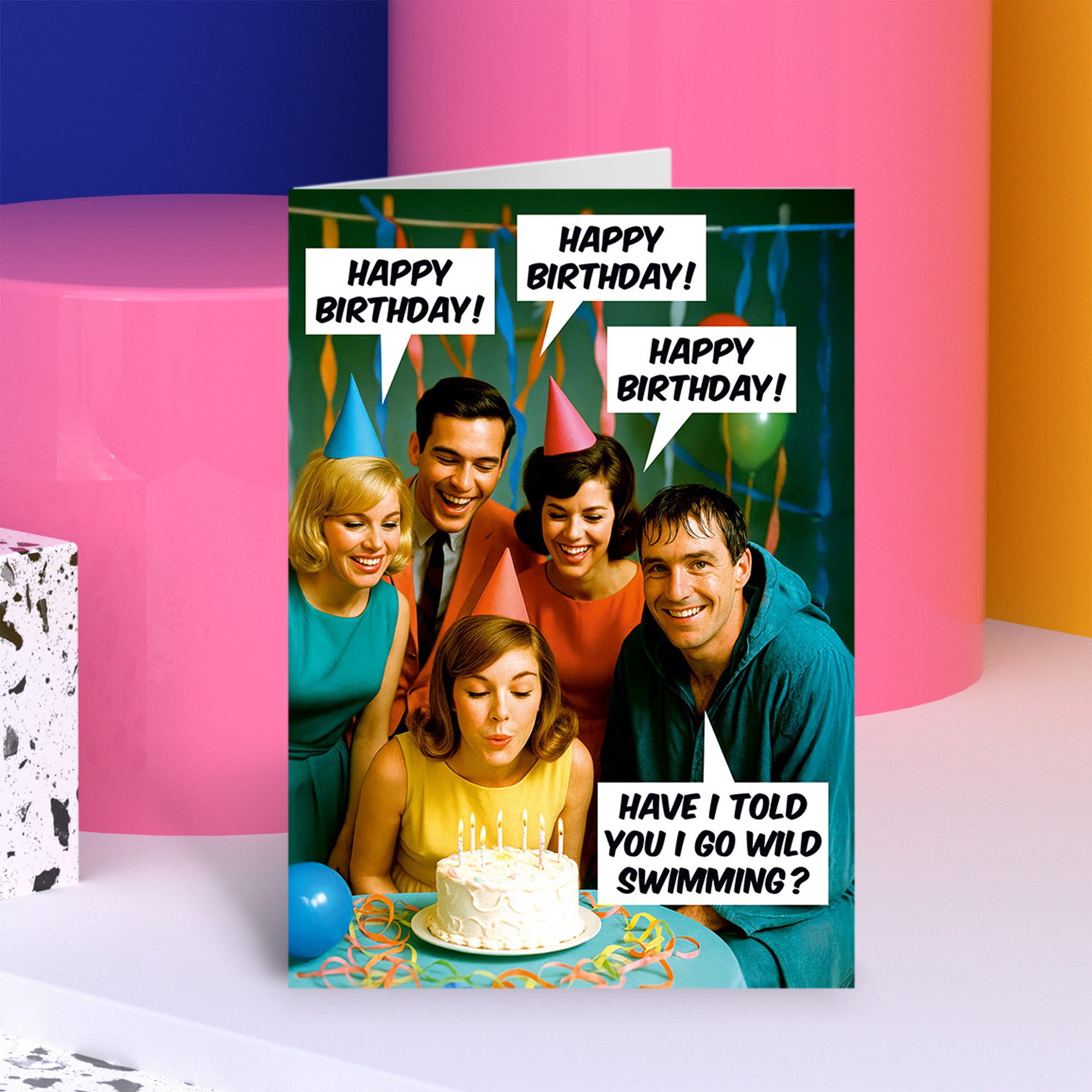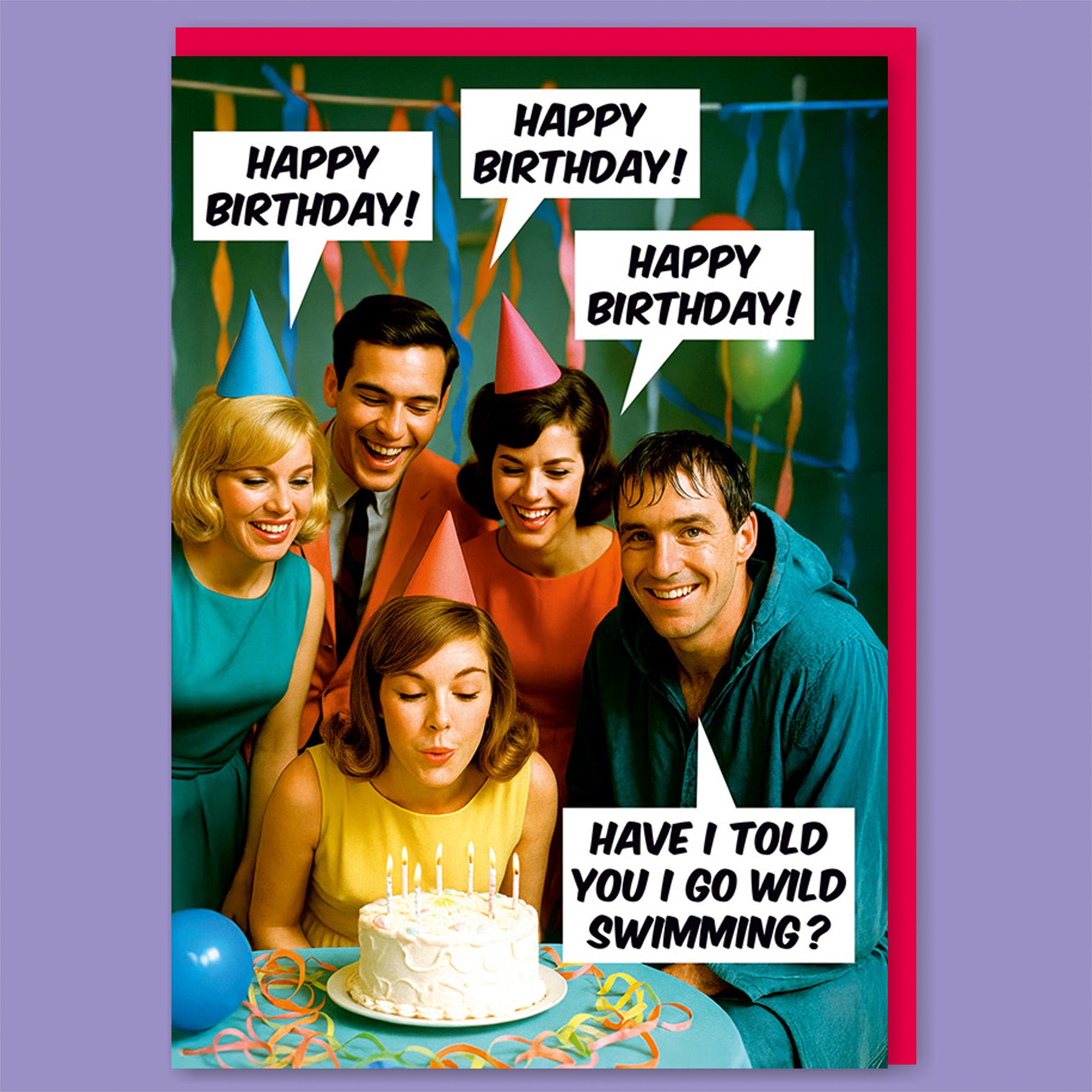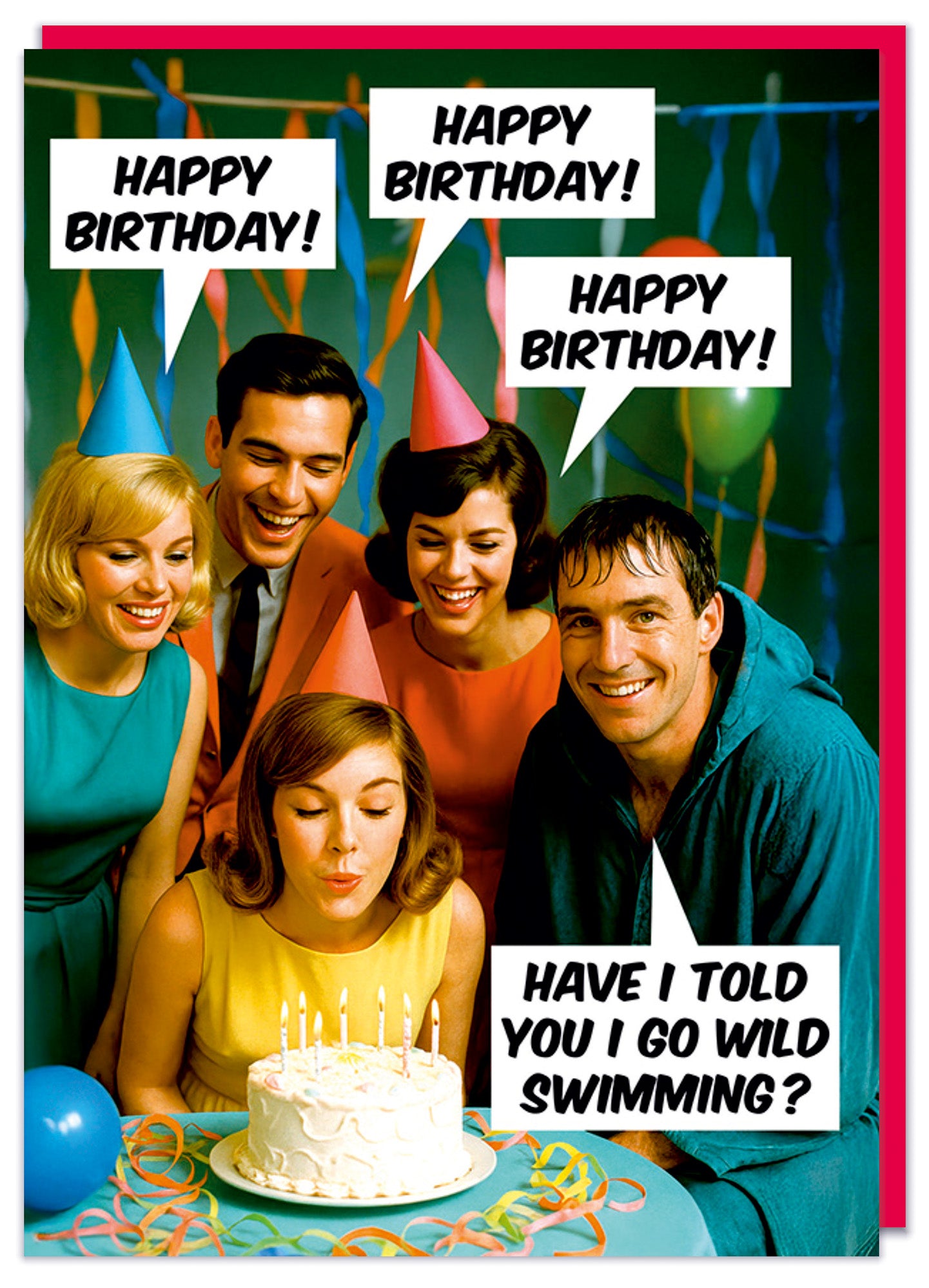 A funny birthday card featuring a vintage-style photograph of five adults wearing party hats and gathered around a birthday cake with lit candles. A woman in the center is leaning forward to blow out the candles while the group smiles around her. Colorful streamers decorate the background. Several speech bubbles read “Happy Birthday!” while one speech bubble from a man on the right reads “Have I told you I go wild swimming?”