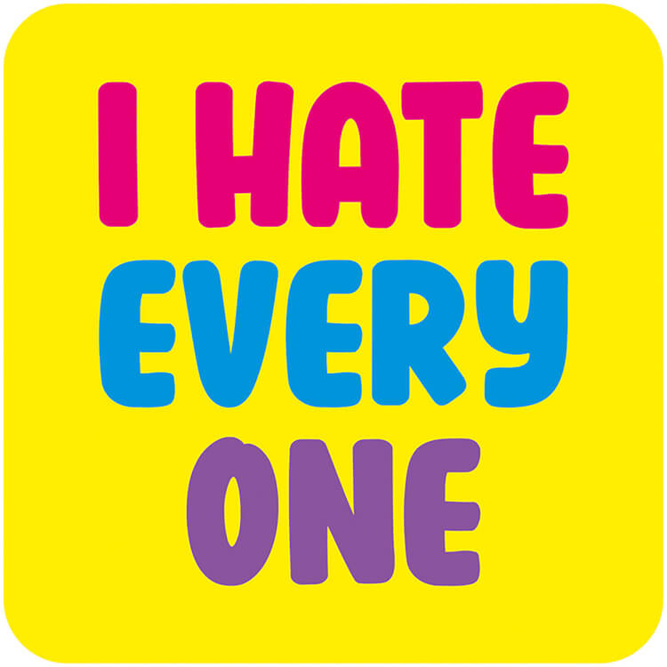 A bright yellow coaster with bold pink, blue and purple in the middle the reads i hate everyone.