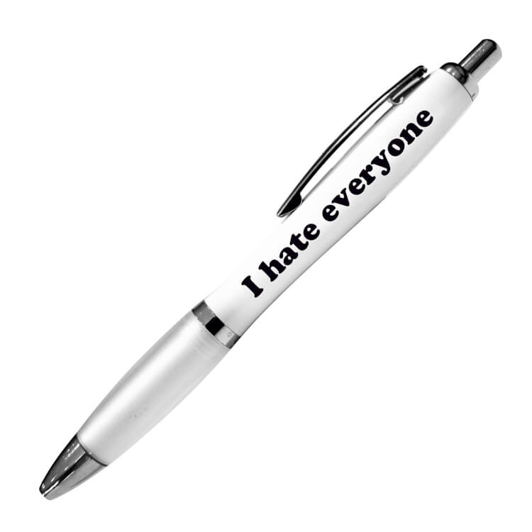 A white ballpoint pen with a white grip and black ink. Black rounded lowercase text on one side reads I hate everyone.