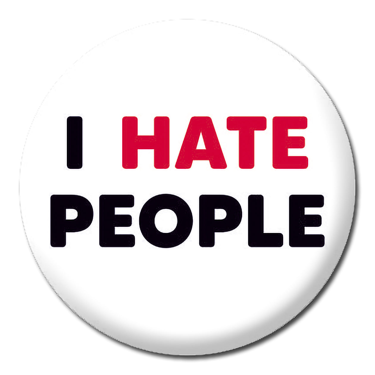 A round white badge featuring bold text only. The words “I hate” appear in black, the word “hate” is highlighted in red, and the word “people” appears in black. The text is centered and evenly spaced, with no additional graphics or images.