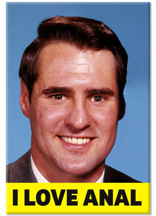 A fridge magnet with a 1960’s style colour headshot of a smiling chap, looking into camera, against a blue backdrop, and dressed in a suit. It has the caption ‘I love anal’ in big bold capital letters at the bottom (ironically) on a yellow banner.