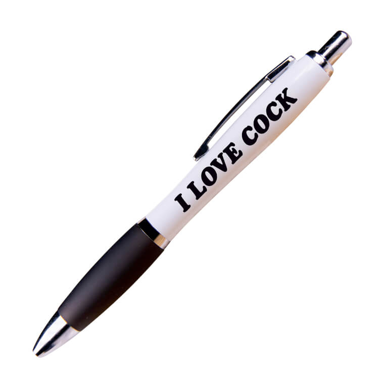 A white ballpoint pen with a black grip and black ink. Black text on one side reads I love cock.