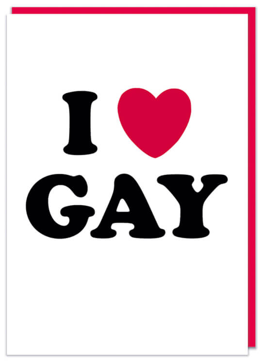 A plain white birthday card with bold rounded black text that reads I love (heart) gay.