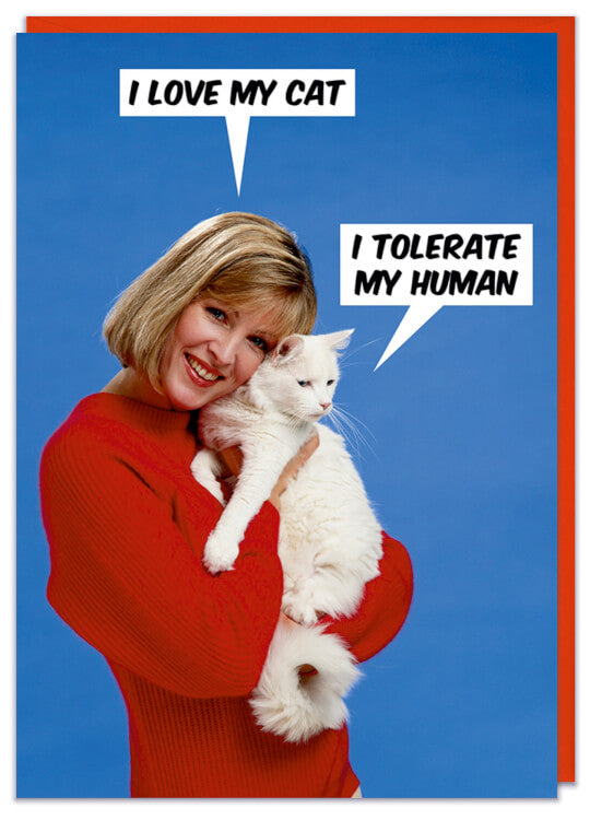 A photo of a woman in a red sweater holding a white cat against a blue background. The woman says I love my cat. The cat replies with I tolerate my human.