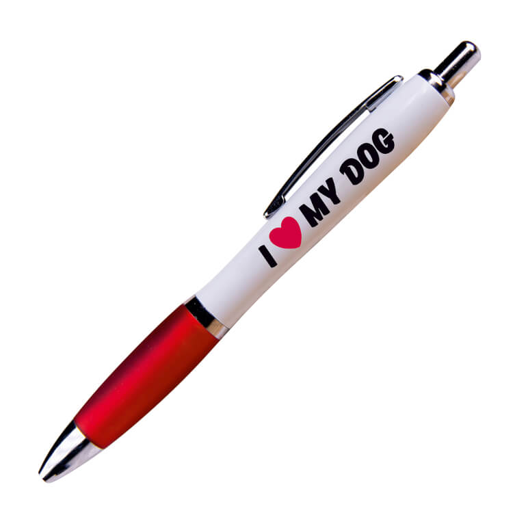 A white ballpoint pen with a red grip and black ink. Bold black text on one side reads I love (heart symbol) my dog.