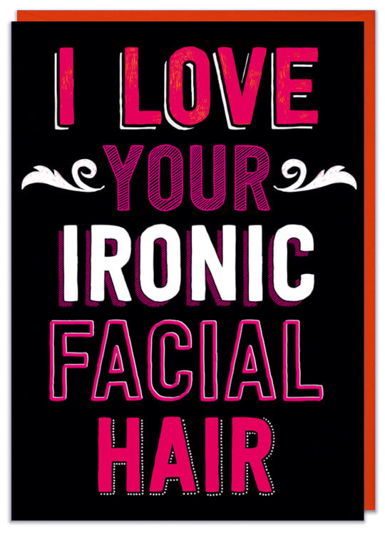 Has he grown his facial hair in an ever so hip, ironic style? Do you wish to tell him that you love it, possibly earnestly, possibly sarcastically? With this card can do both, it all depends on your facial expression when you hand it to him.