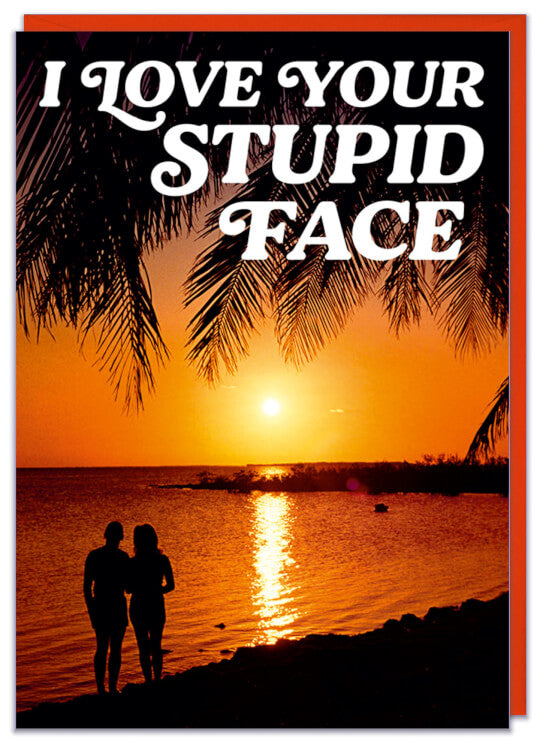 A Valentines card featuring a romantic sunset beach scene with a silhouetted couple. White slanted text at the top reads I love your stupid face.