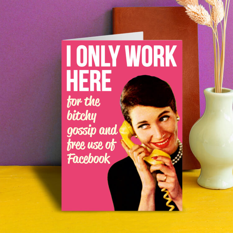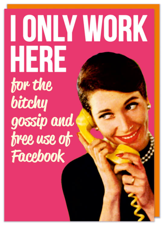 A dark pink card with a vintage style photo of a smiling woman on the phone and next to her are the words ‘I only work here for the bitchy gossip and free use of Facebook’ in white font.