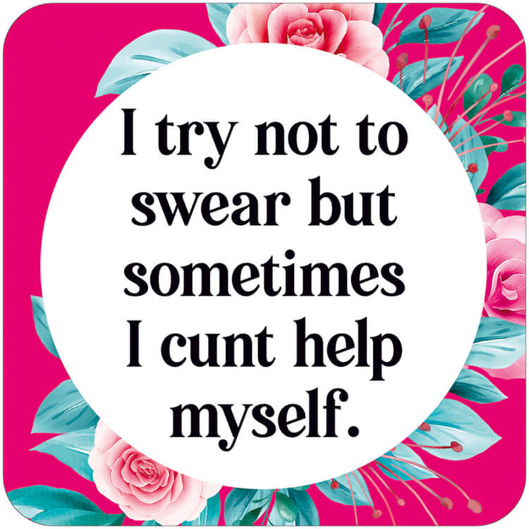 A coaster with smart black text in a white circle surrounded by a pink floral print that reads I try not to swear but sometimes I cunt help myself.
