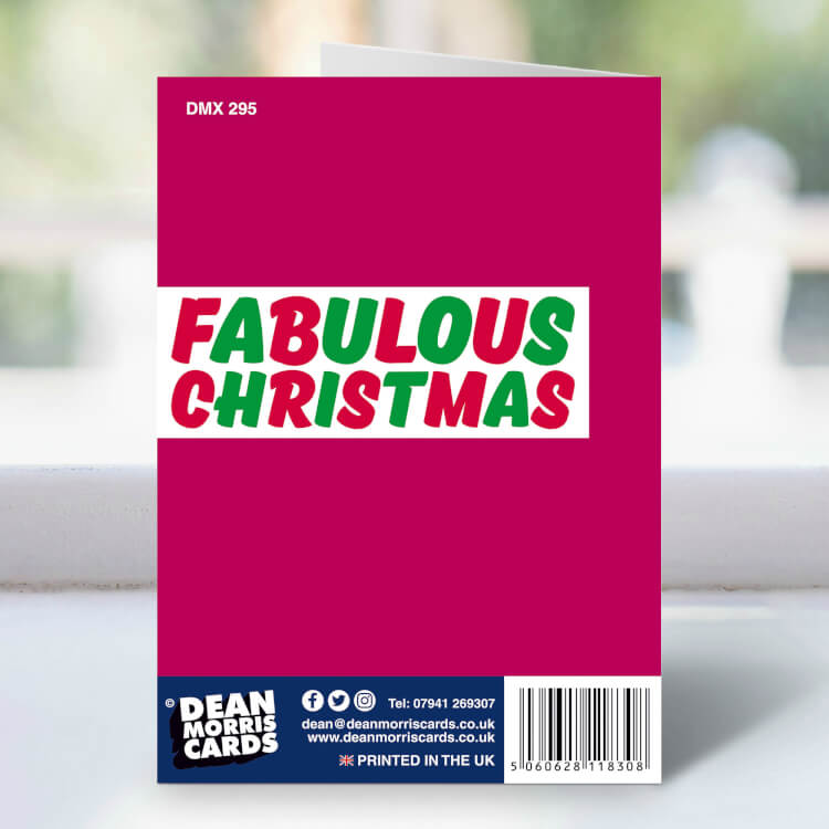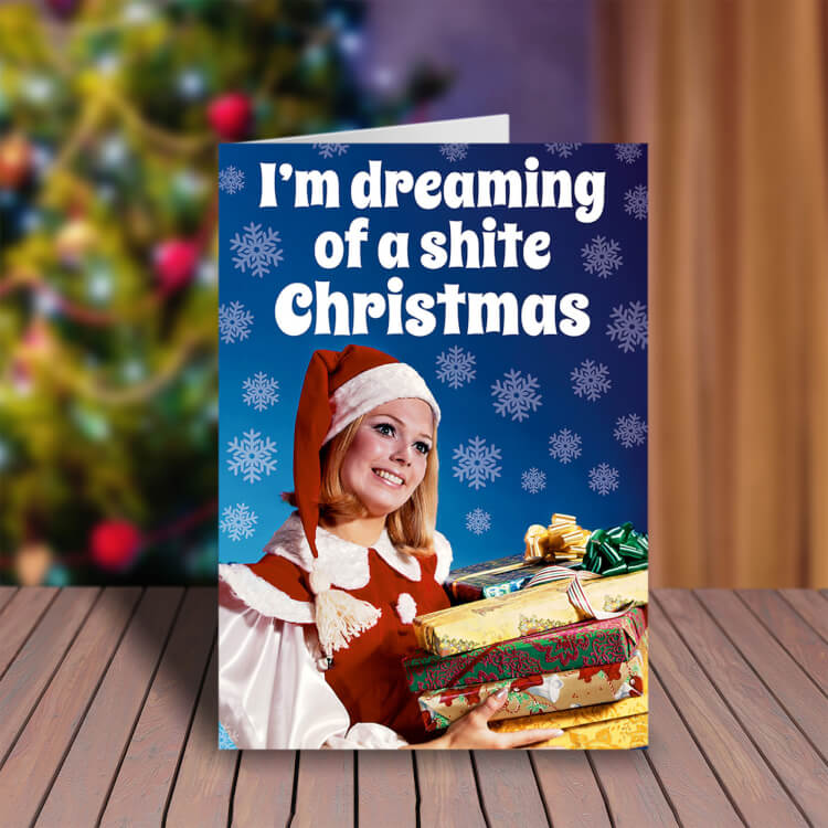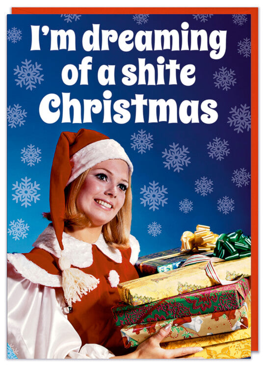 A Christmas card with a retro picture of a smiling young woman dressed as Santa's elf helper holding a bunch of presents. Whimsical text above her reads I'm dreaming of a shite Christmas.
