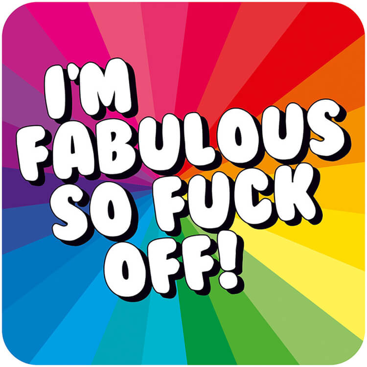 A coaster with a rainbow pattern spreading out from the centre. Bold white rounded text with a black boarder reads I'm fabulous so fuck off.