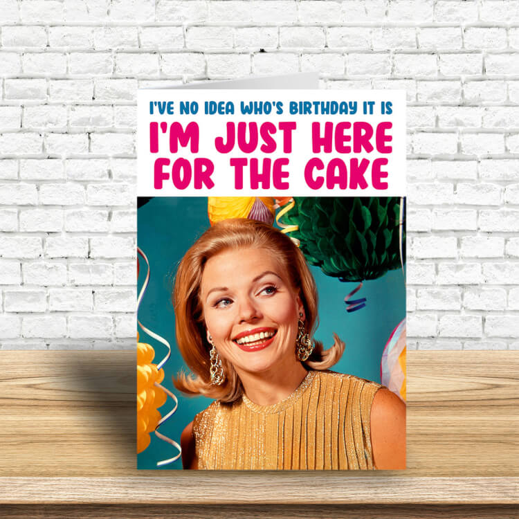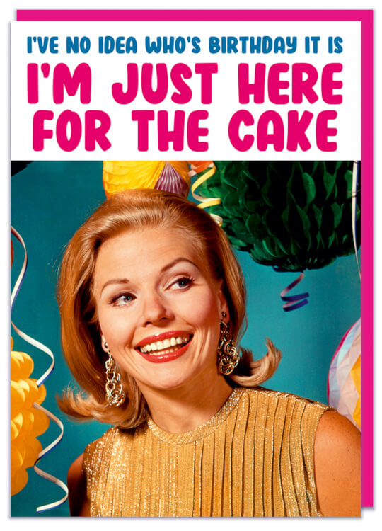A birthday card with a 1960s picture of a smiling woman surrounded by birthday colourful balloons. Blue and pink text above in a white box reads I've no idea who's birthday it is, I'm just here for the cake.