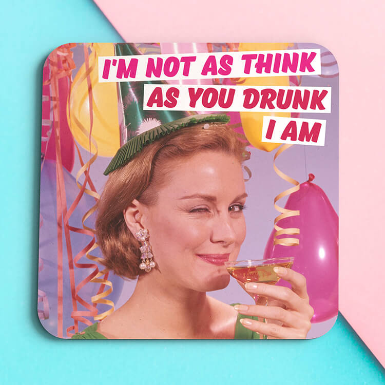 A coaster with a retro-style photo of a woman in front of balloons at a birthday party, wearing a party hat and winking while drinking alcohol. Above her are the words ‘I’m not as think as you drunk I am’ in capitalised, light and dark pink font against a white banner.
