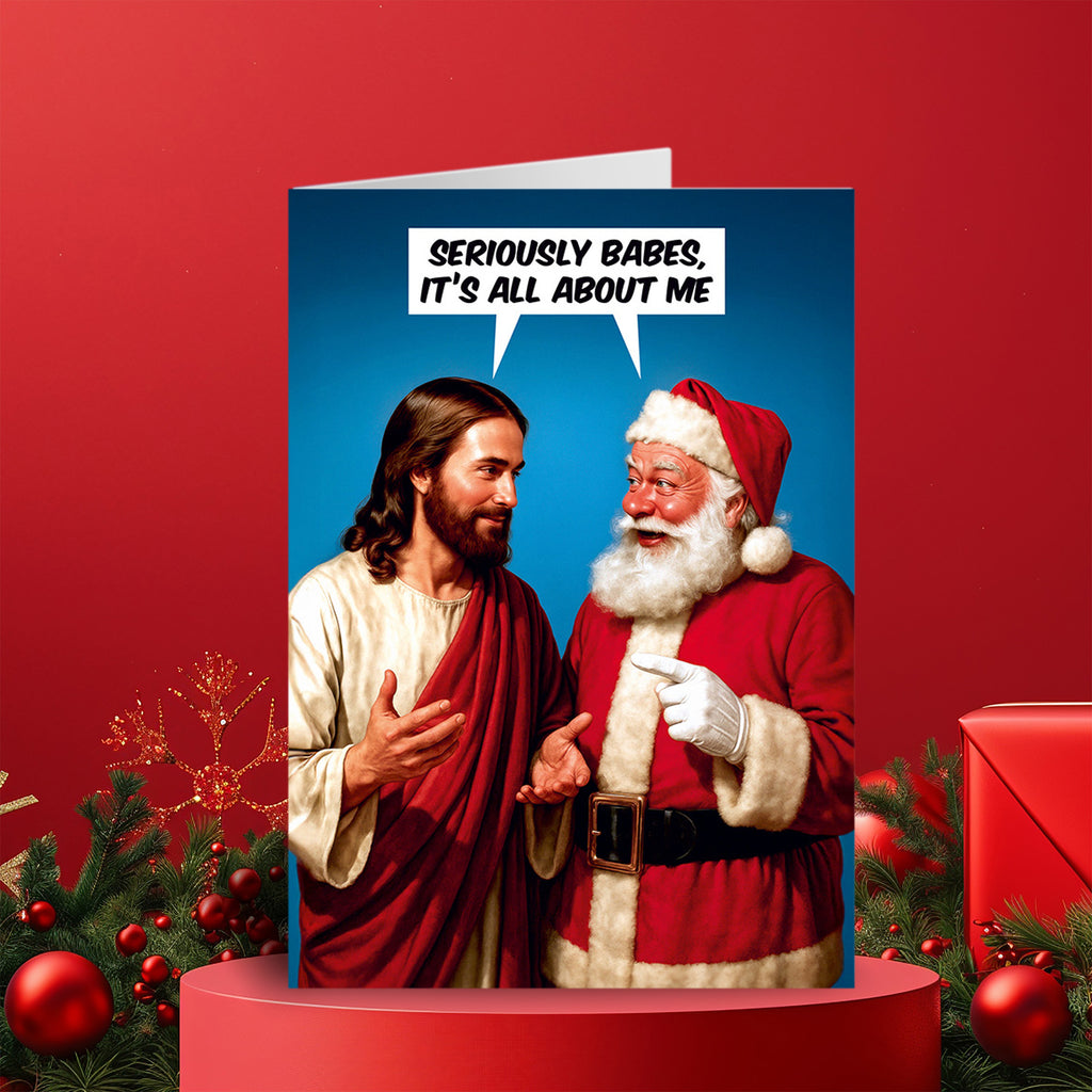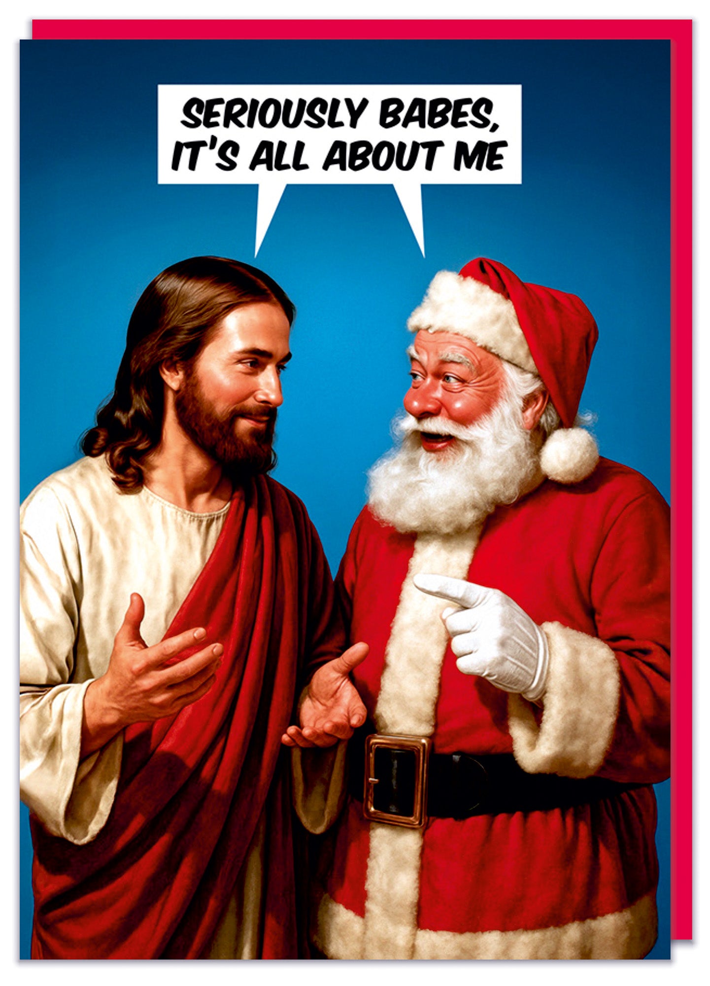 A funny Christmas card featuring a picture of Jesus and Father Christmas engaged in a healthy discussion pointing at each other. Both are saying Seriously babes, it's all about me.