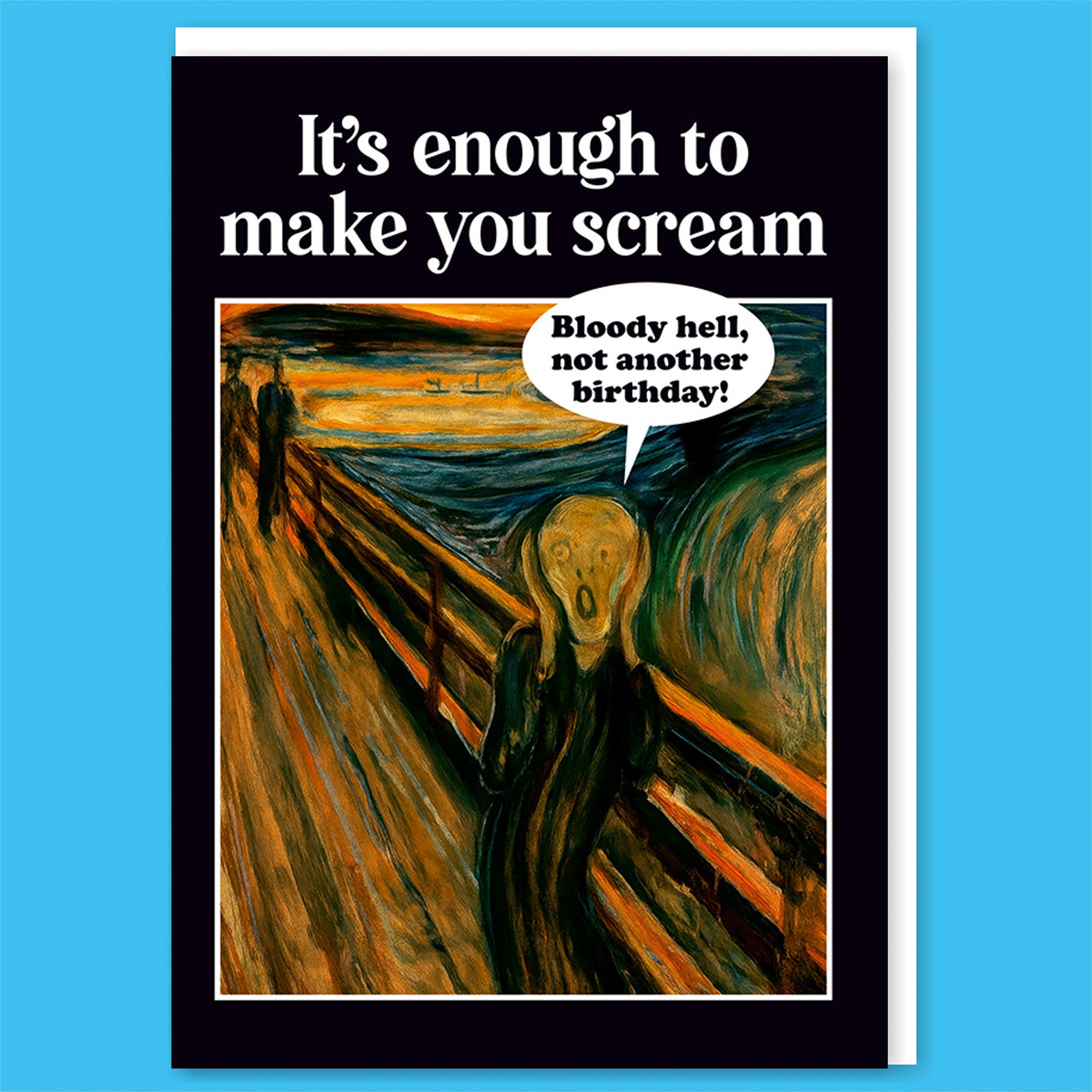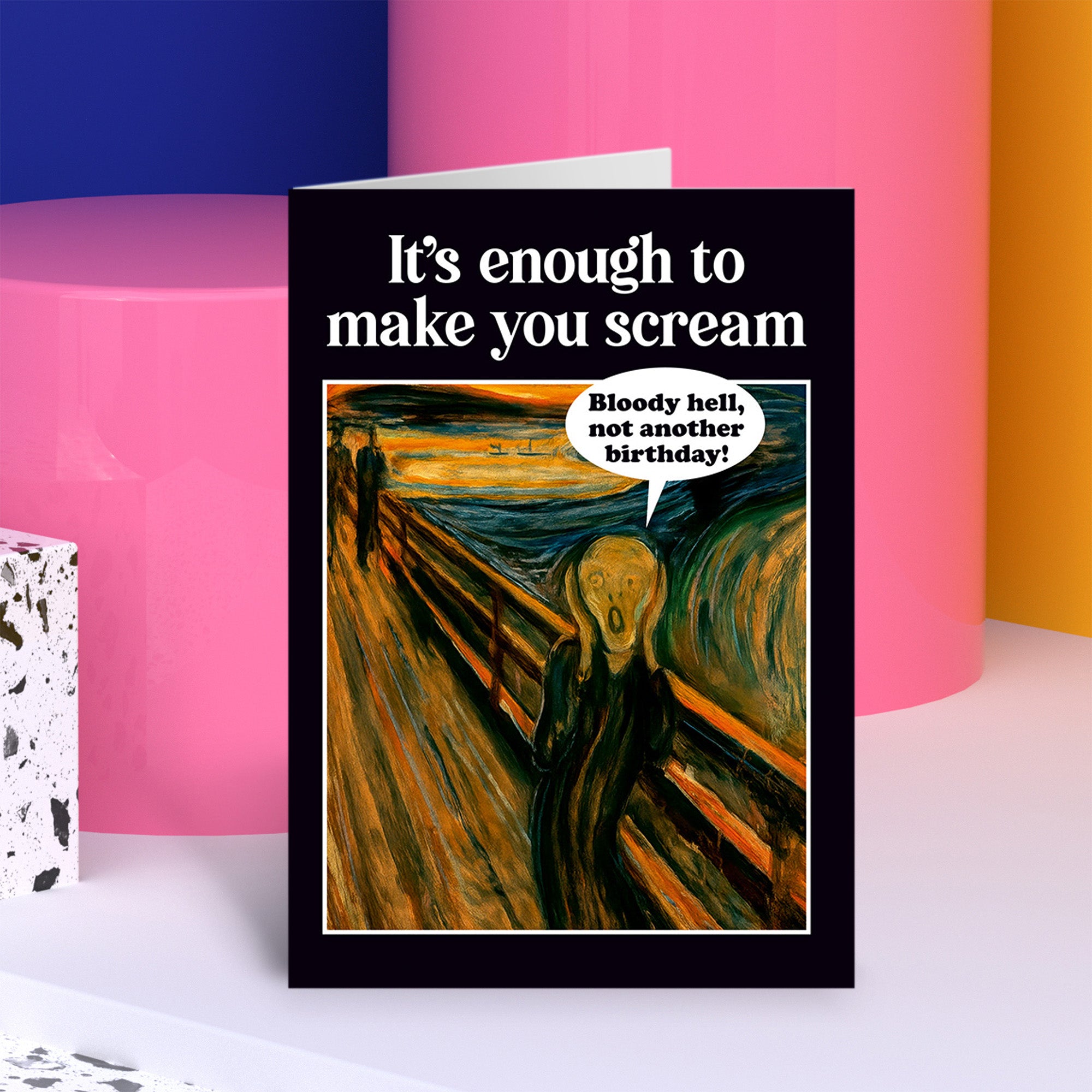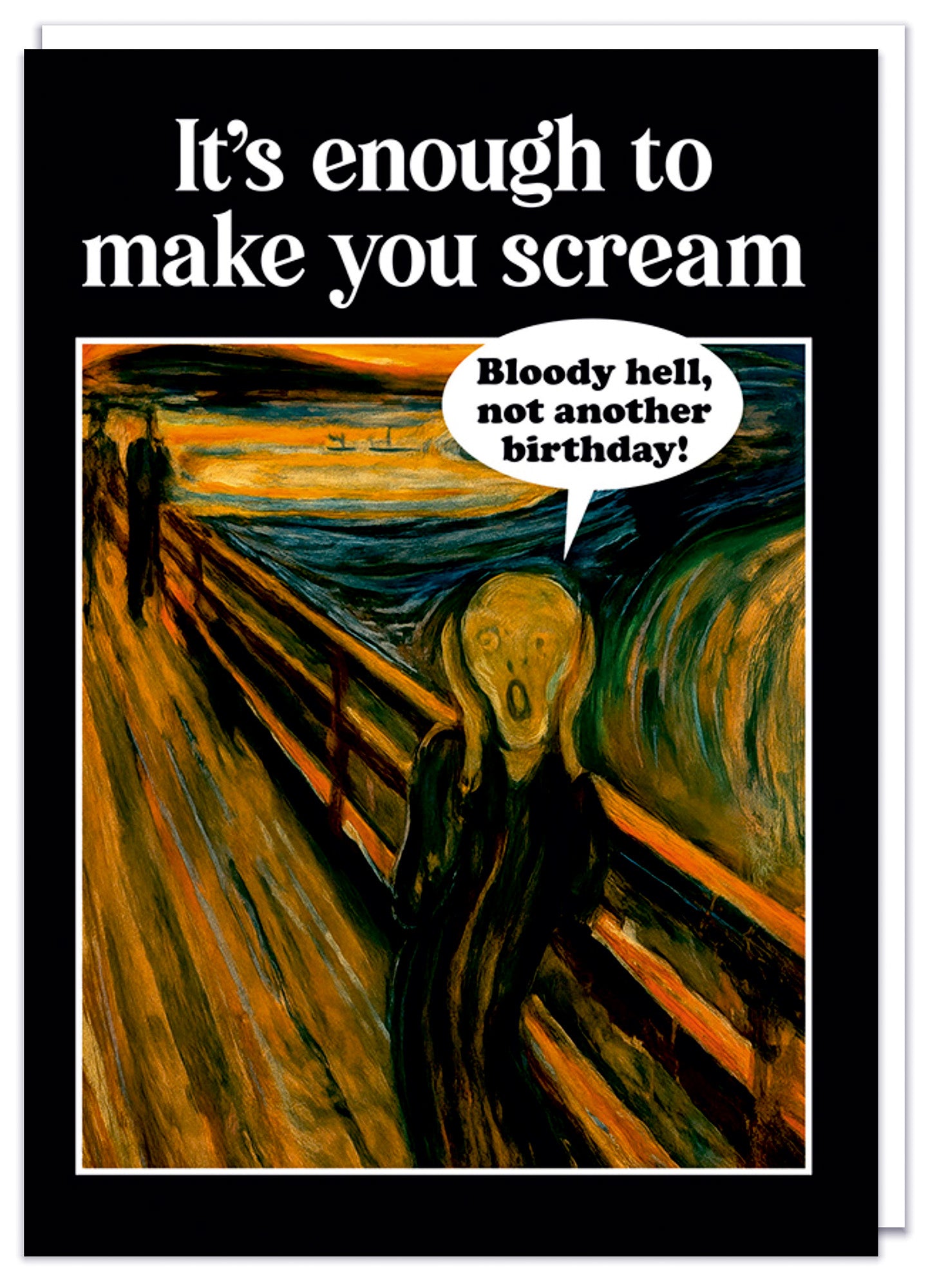 A funny birthday card featuring a reproduction-style image inspired by Edvard Munch’s painting “The Scream.” The central figure stands on a bridge, holding their face in distress as swirling colours fill the background. A speech bubble above the figure reads “Bloody hell, not another birthday!” Large white text at the top says “It’s enough to make you scream.”