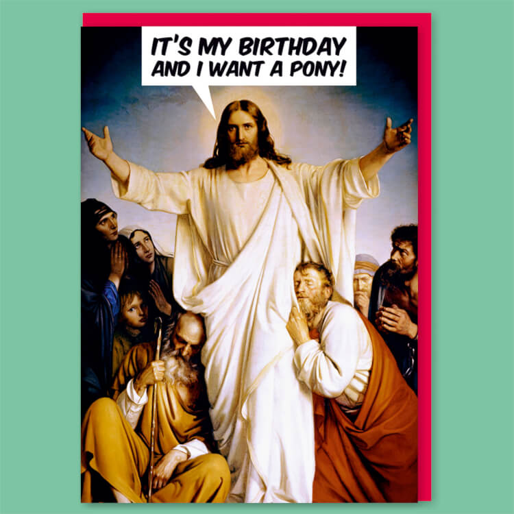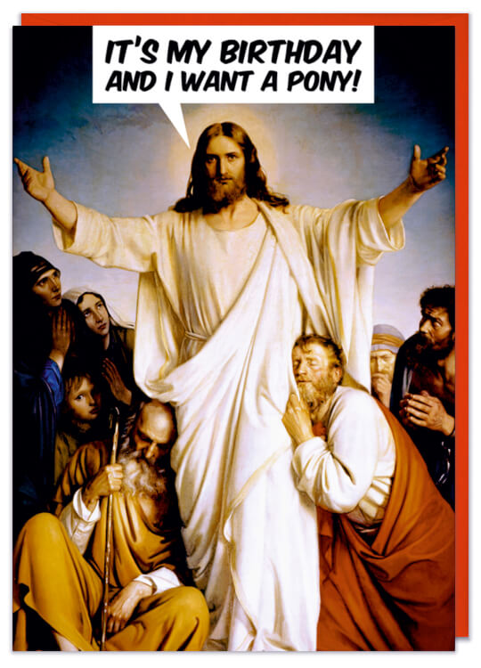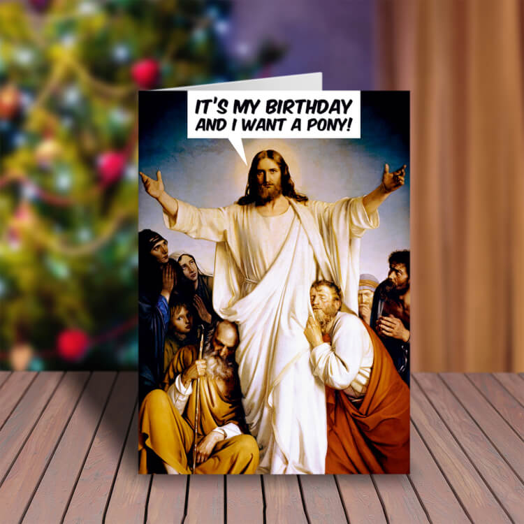 A Christmas card with a painting of Jesus holding his hands up and surrounded by loving disciples. He is saying It's my birthday and I want a pony!
