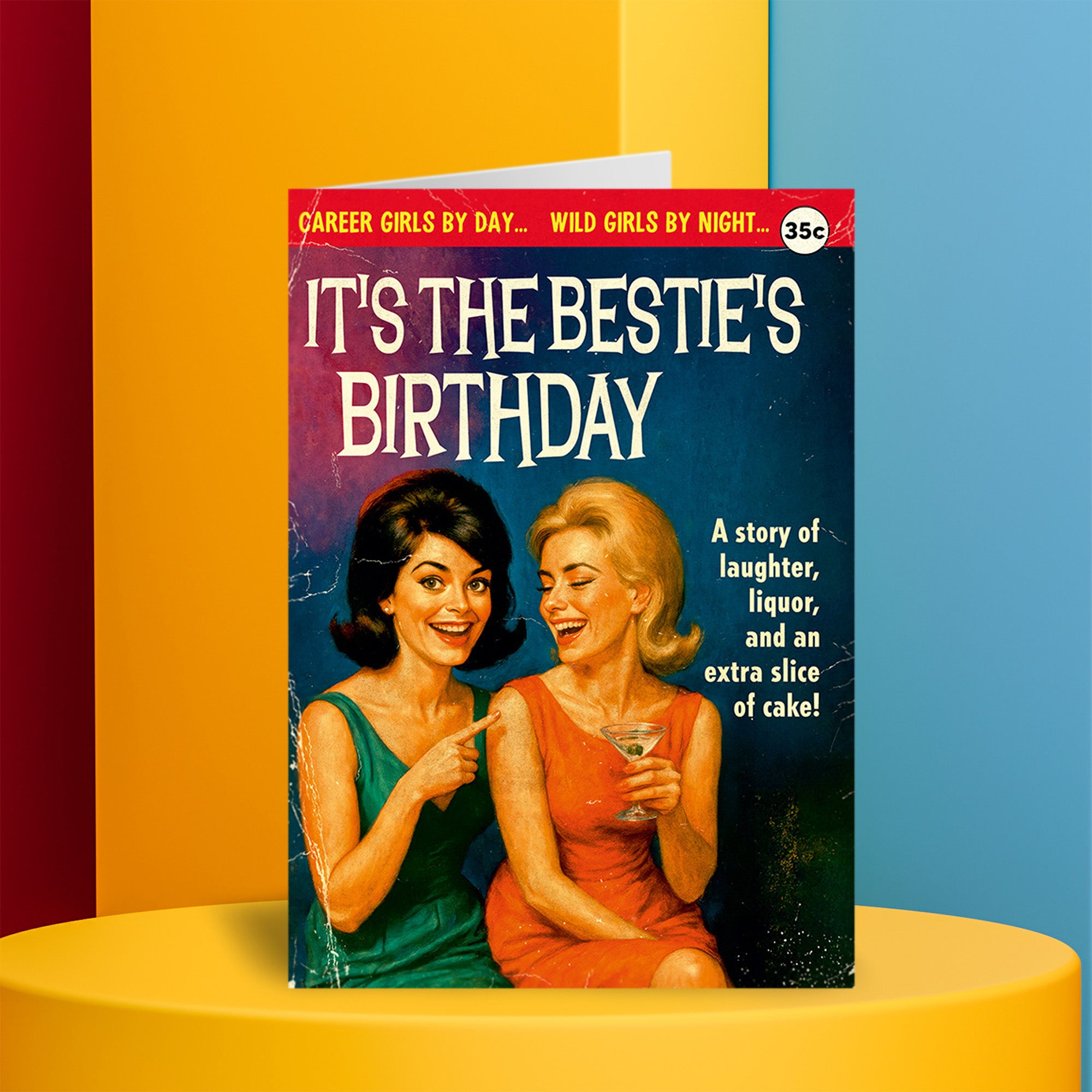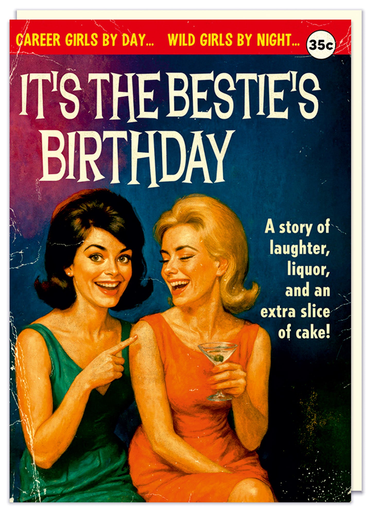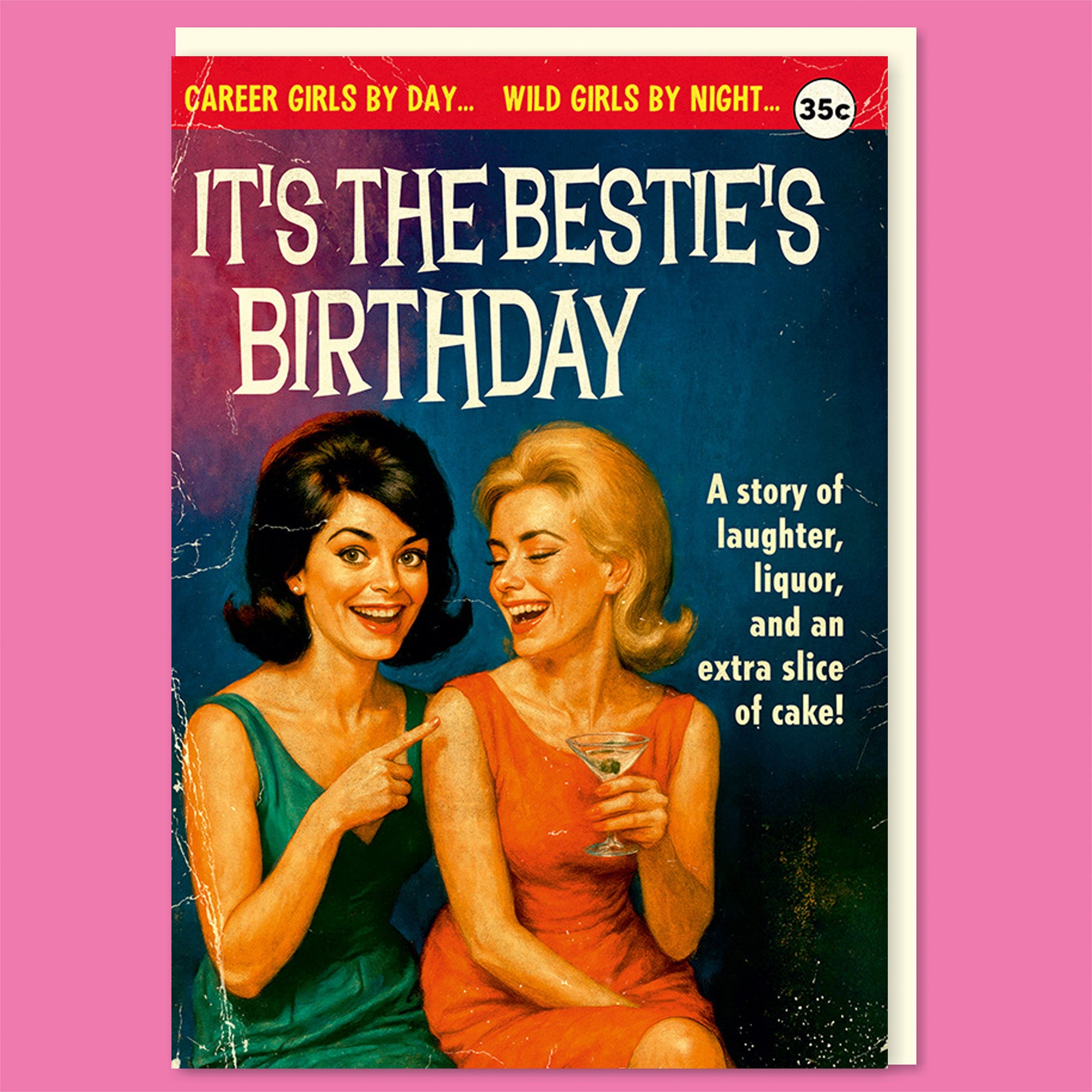 A greeting card styled as the cover of a sensational vintage paperback, inspired by trashy midcentury pulp novels. The bold headline reads “It’s the Bestie’s Birthday,” framed by dramatic teaser text promising double lives and late nights. The illustration shows two glamorous women mid-laughter, one pointing knowingly while the other clutches a cocktail, perfectly capturing that best-friend energy. The design uses rich, saturated colours, worn paper textures, exaggerated retro typography, and classic pulp details including a mock price stamp, over-the-top taglines, and breathless promises of laughter, liquor, and extra cake.