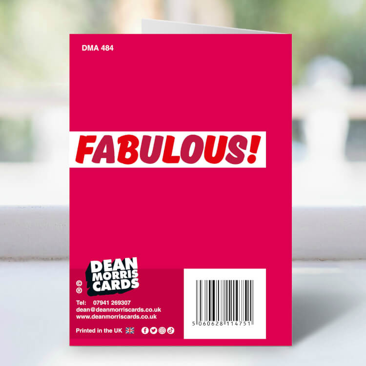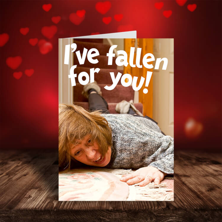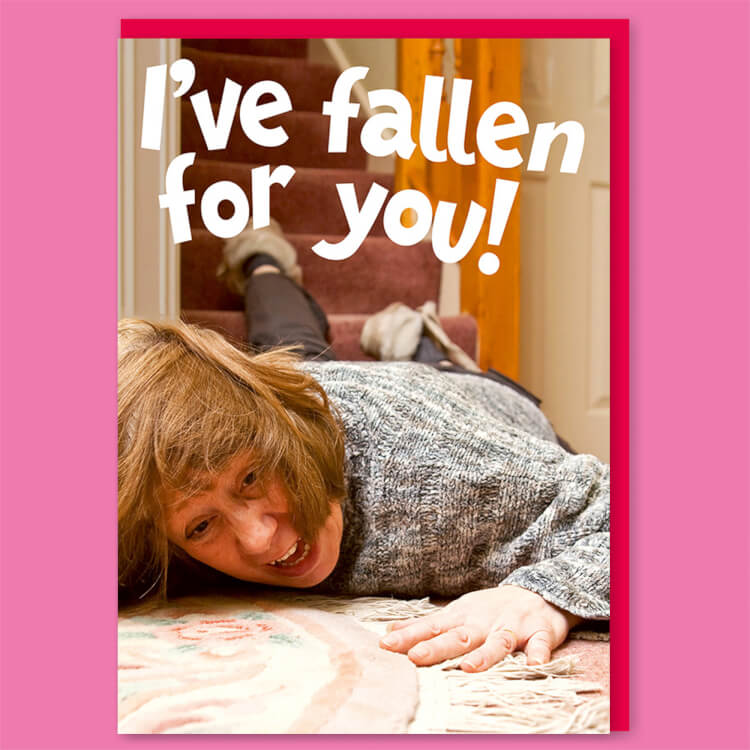 A Valentine's Day card with a dramatic posed photo of an old lady fallen down some stairs. Funky text above the image reads I've fallen for you.