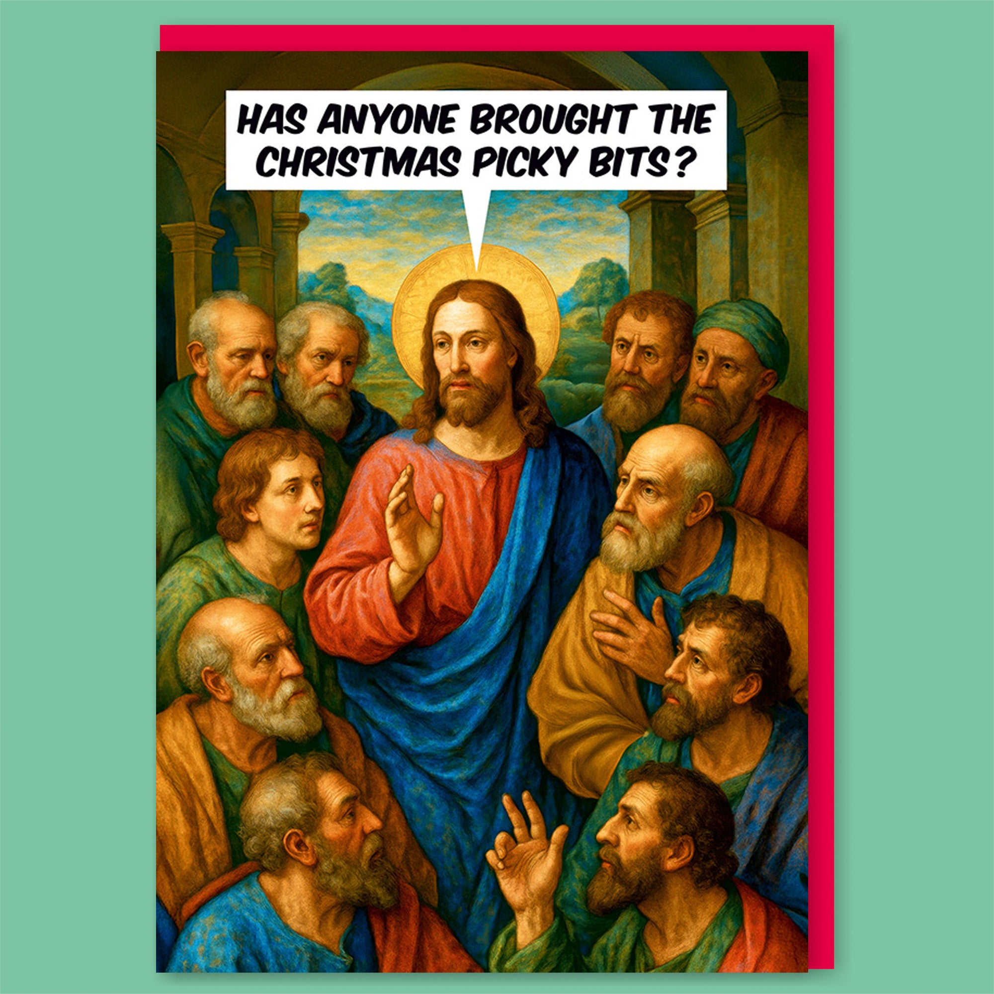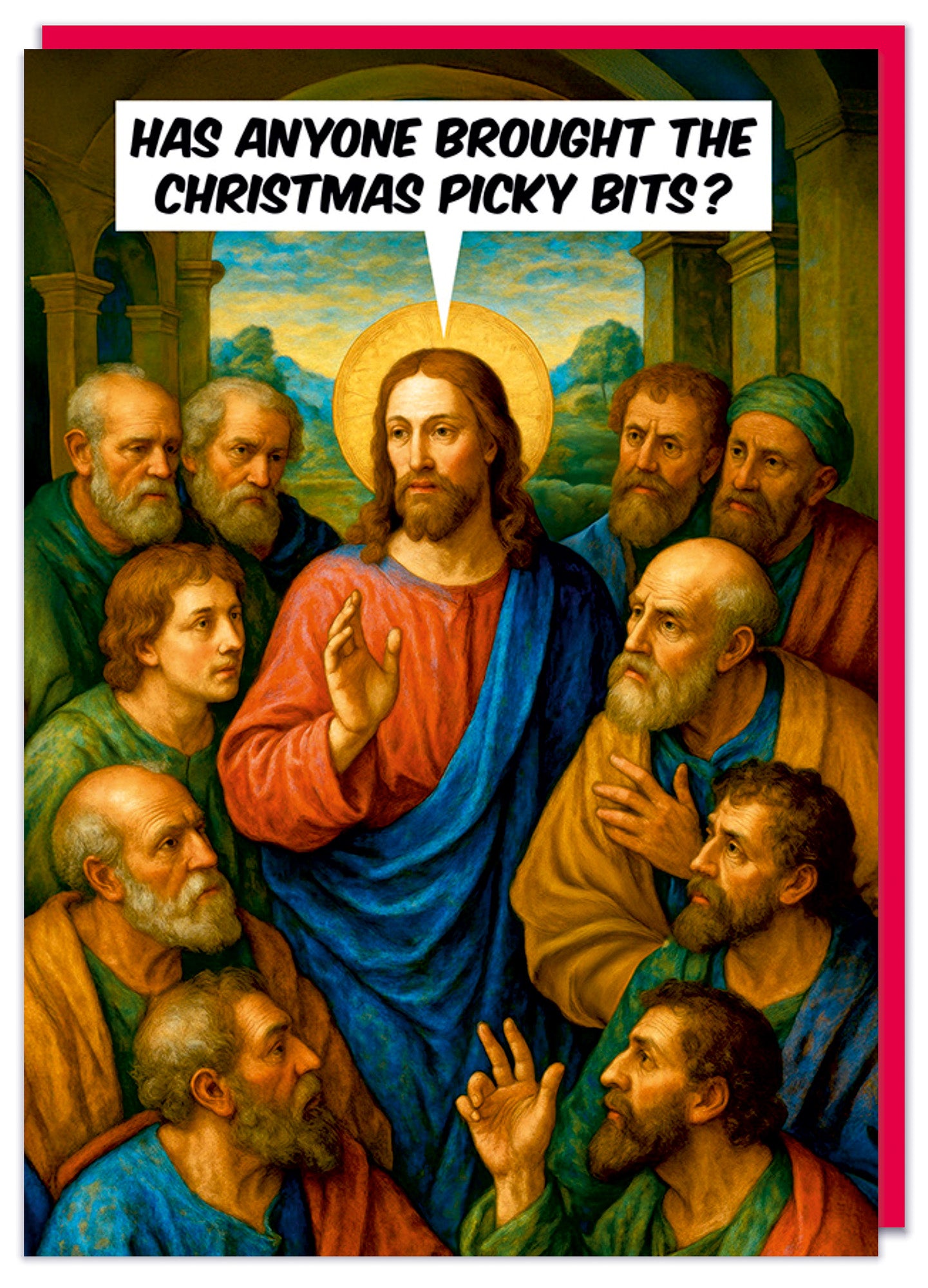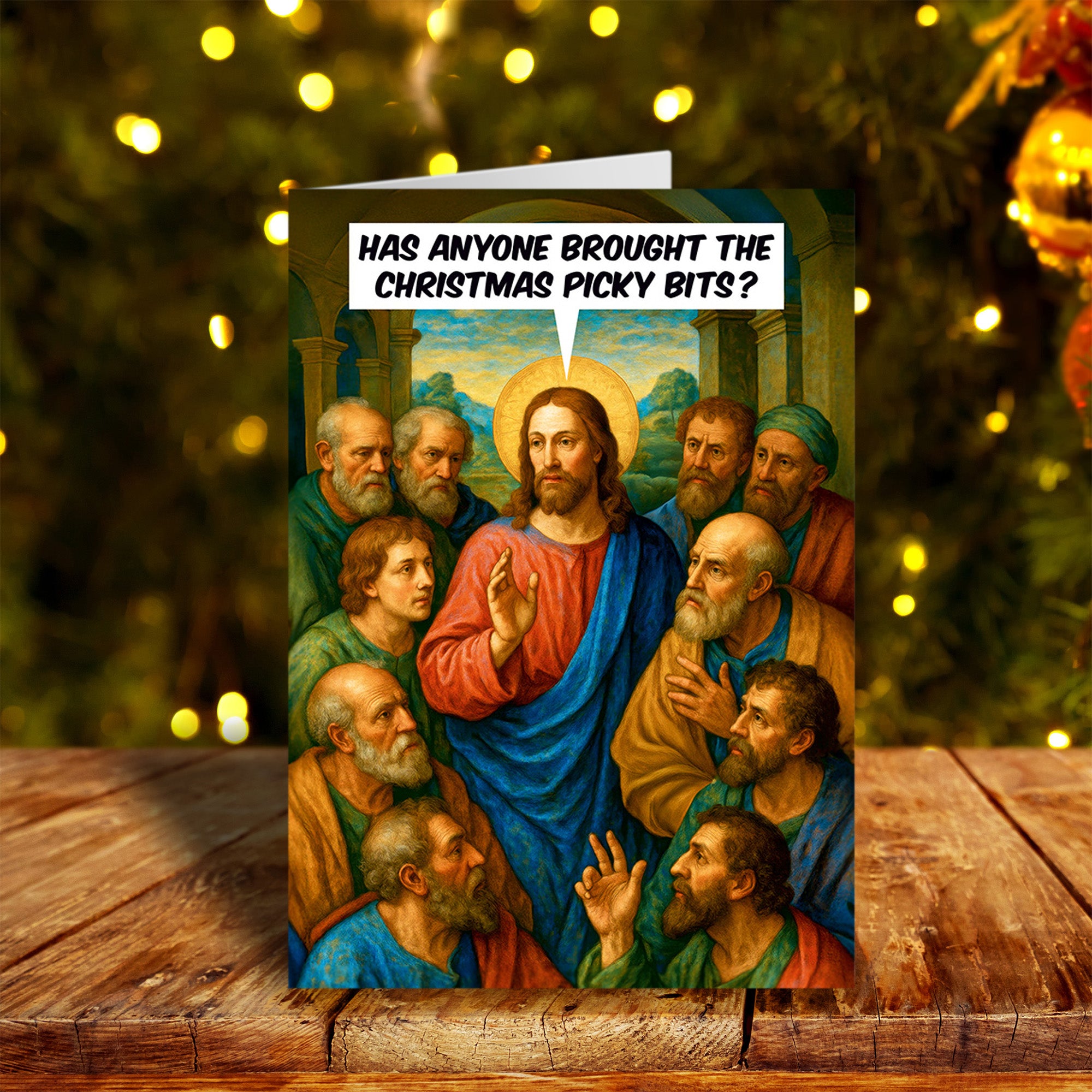 A funny Christmas card featuring a classic painted scene of Jesus surrounded by a group of disciples. A speech bubble above him reads has anyone brought the christmas picky bits? in bold comic-style lettering.