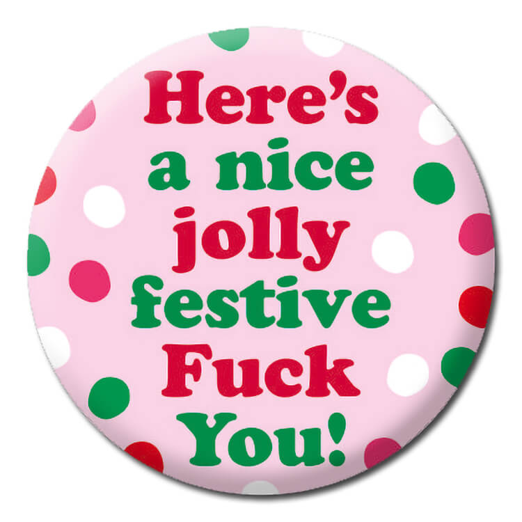 A pink badge with red, green and white spots surrounding red and green text that reads Here's a nice jolly festive fuck you.