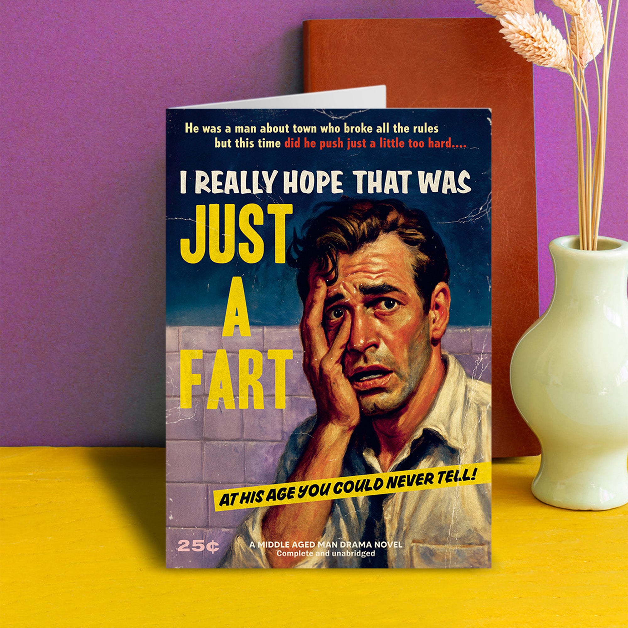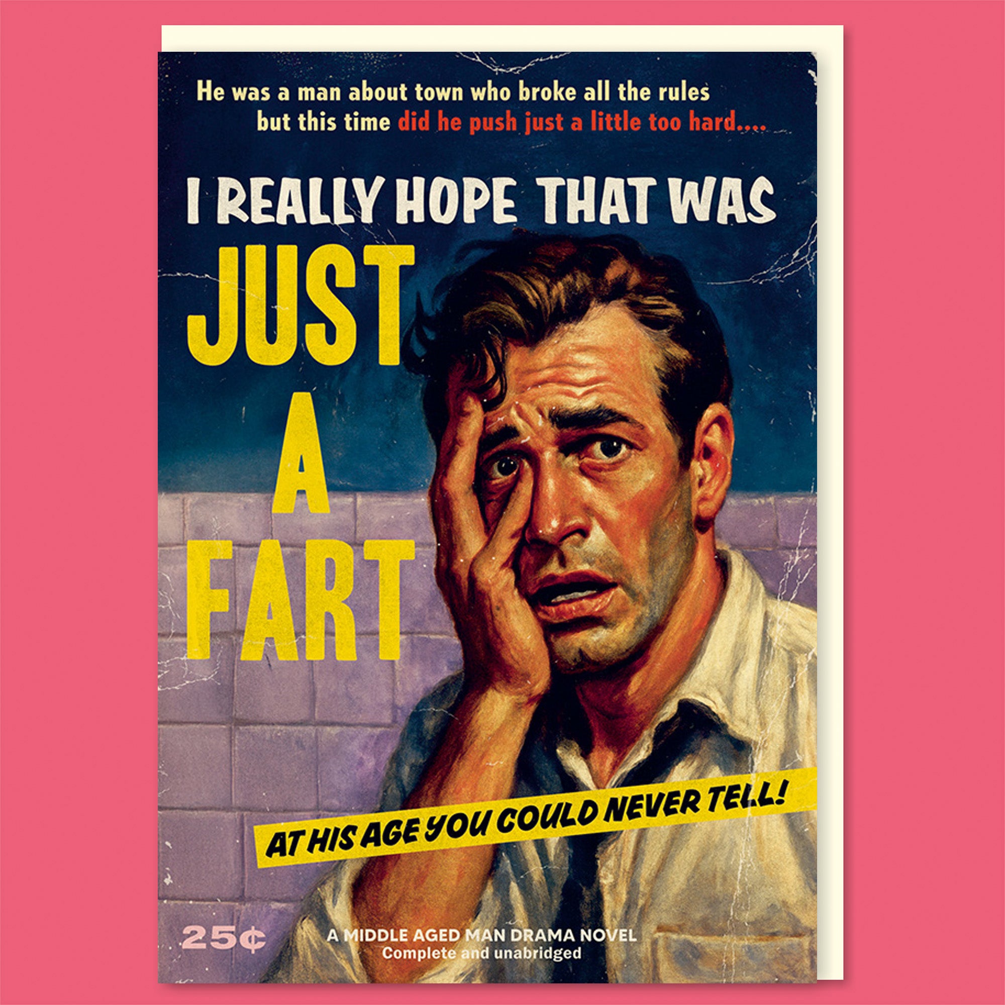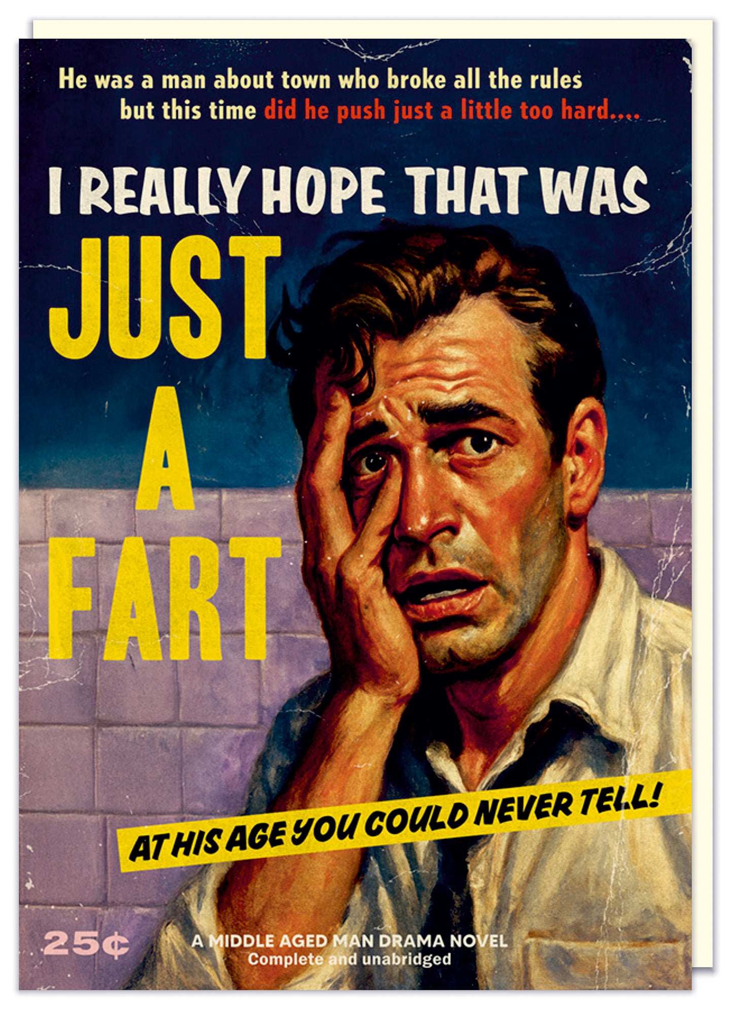 A birthday card designed to look like the cover of a lurid vintage paperback, inspired by trashy midcentury pulp novels. The oversized, dramatic title reads “I Really Hope That Was Just a Fart,” with a bold yellow emphasis on the word “JUST.” Smaller teaser text promises regret, poor judgement, and irreversible decisions. The illustration shows a distressed middle-aged man in a bathroom, sweat-soaked and panicked, clutching his face as reality sets in. The design features worn textures, faded colours, exaggerated typography, and classic pulp details including a mock price stamp, sensational taglines, and a banner declaring it “A Middle Aged Man Drama Novel – Complete and Unabridged.”
