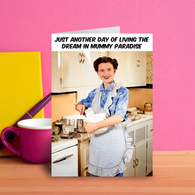A funny card, perfect for Mother's Day with a retro picture of a mum whisking and holding a bowl. She says Just another day living the dream in Mummy paradise.