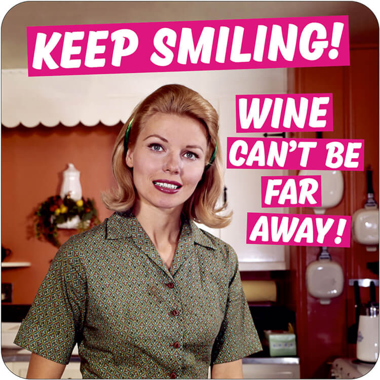 A coaster with a retro-style photo of a woman forcing a smile for the camera and next to her are the words ‘Keep smiling! Wine can’t be far away!’ in white capitalised font against a pink banner.