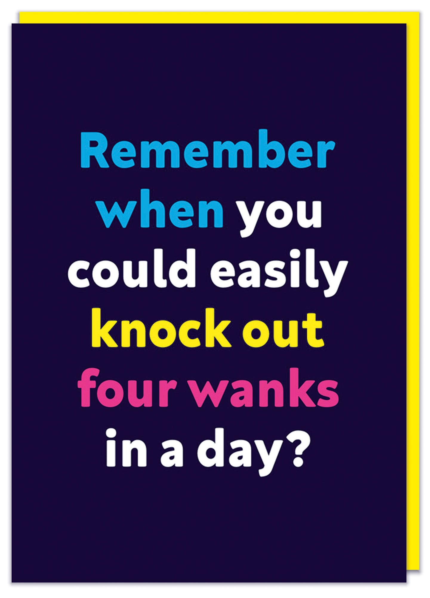 A dark blue birthday card with simple white, yellow, pink and blue text that reads Remember when you could easily knock out four wanks in a day?