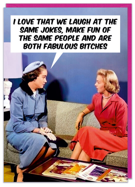 A birthday card with a retro picture of two well dressed women sitting on a sofa. One in a blue dress says I love that we laugh at the same jokes, make fun of the same people and are both fabulous bitches.