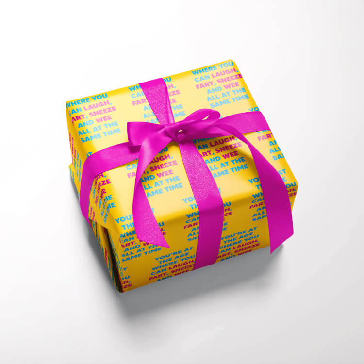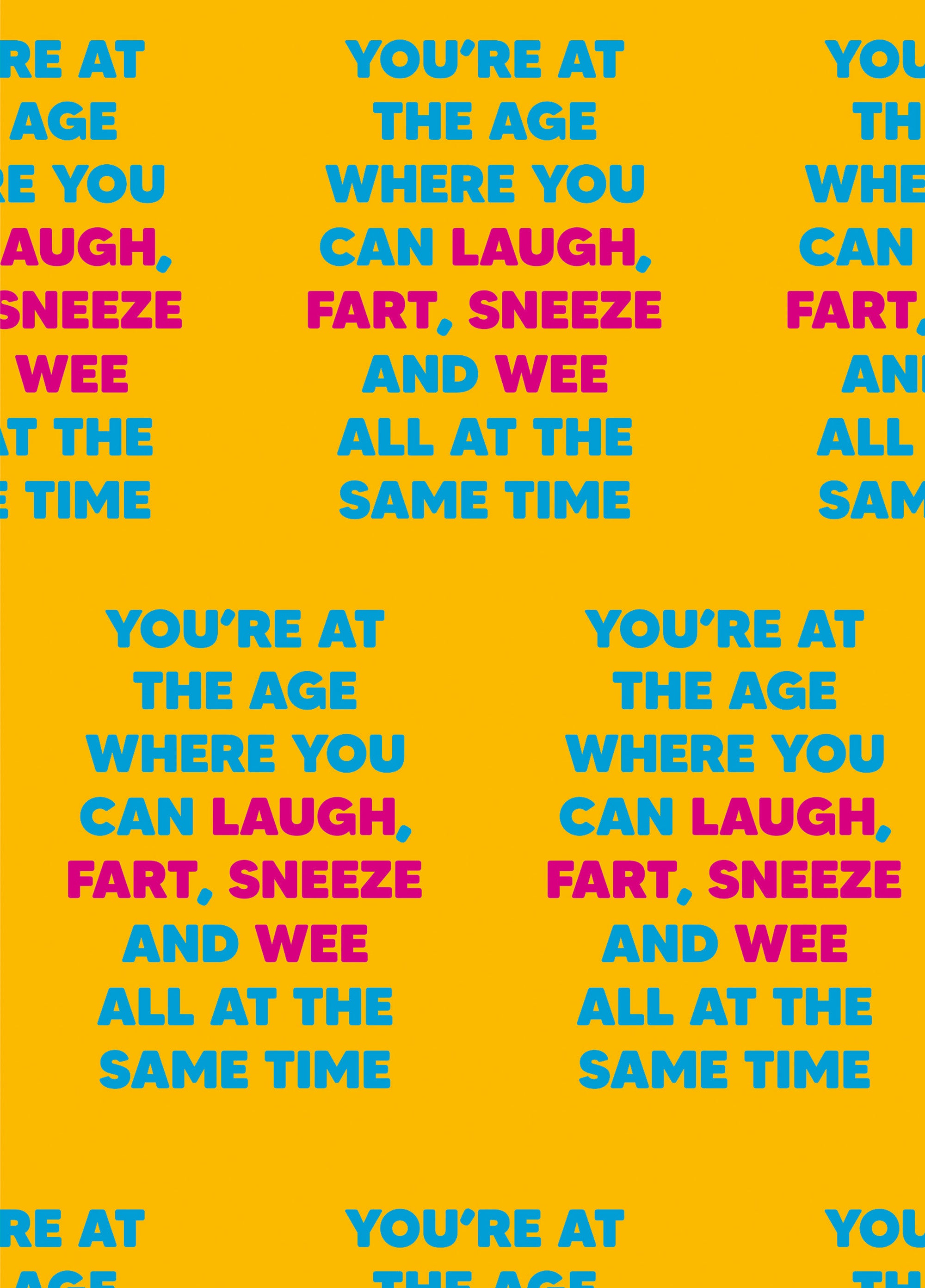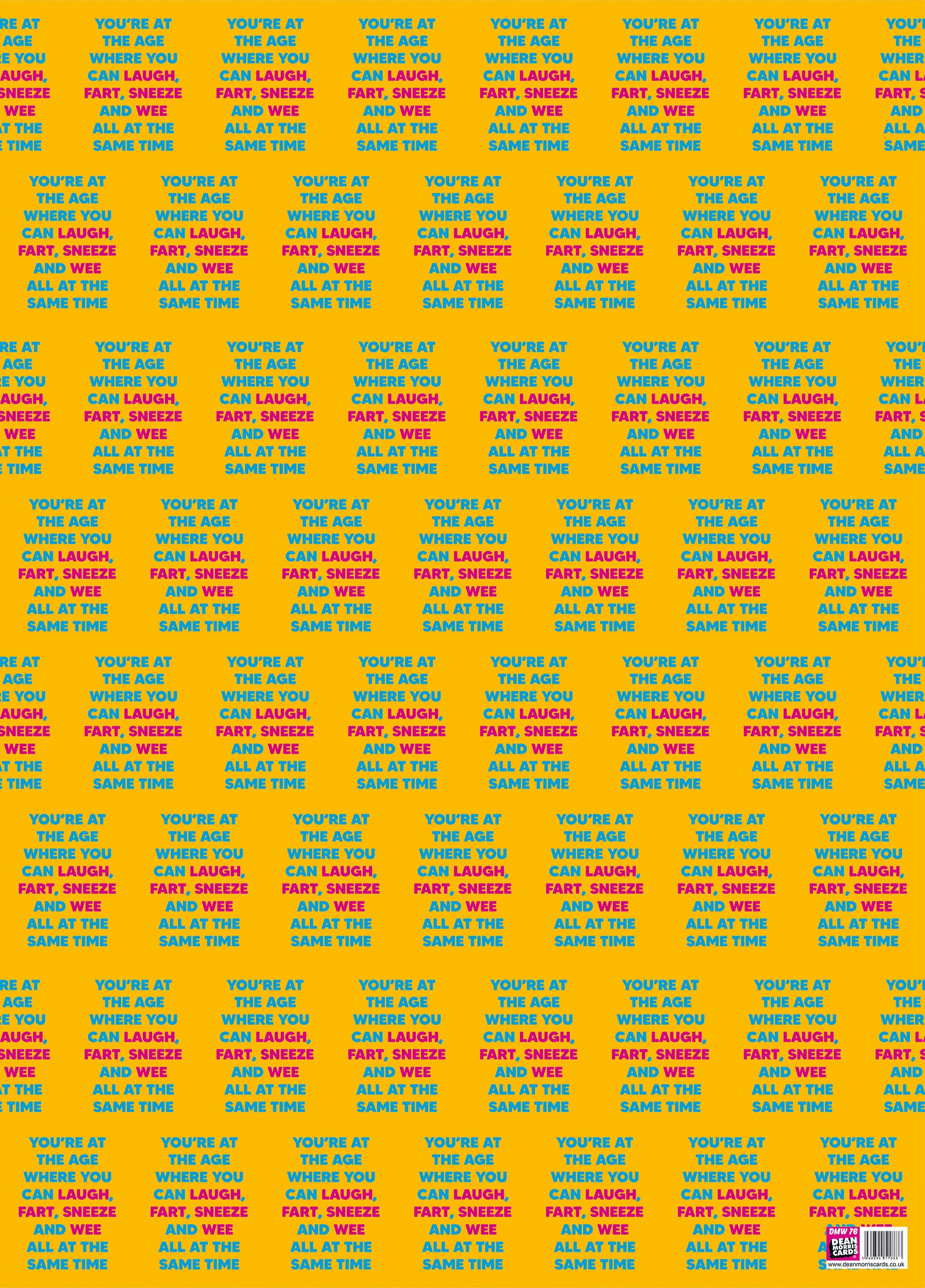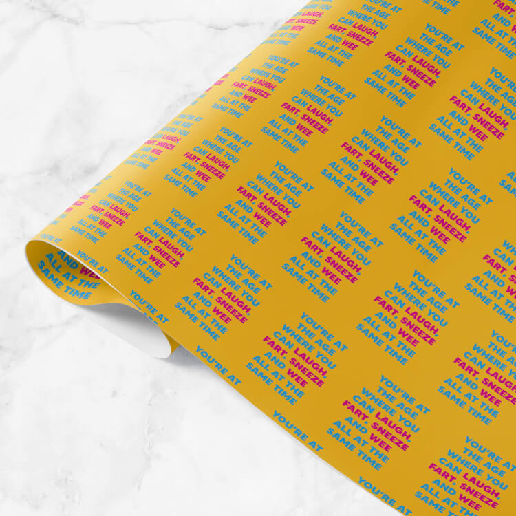 Bright deep yellow birthday wrapping paper with repeated blue and pink text that reads You're at the age where you can laugh, fart, sneeze and wee all at the same time.
