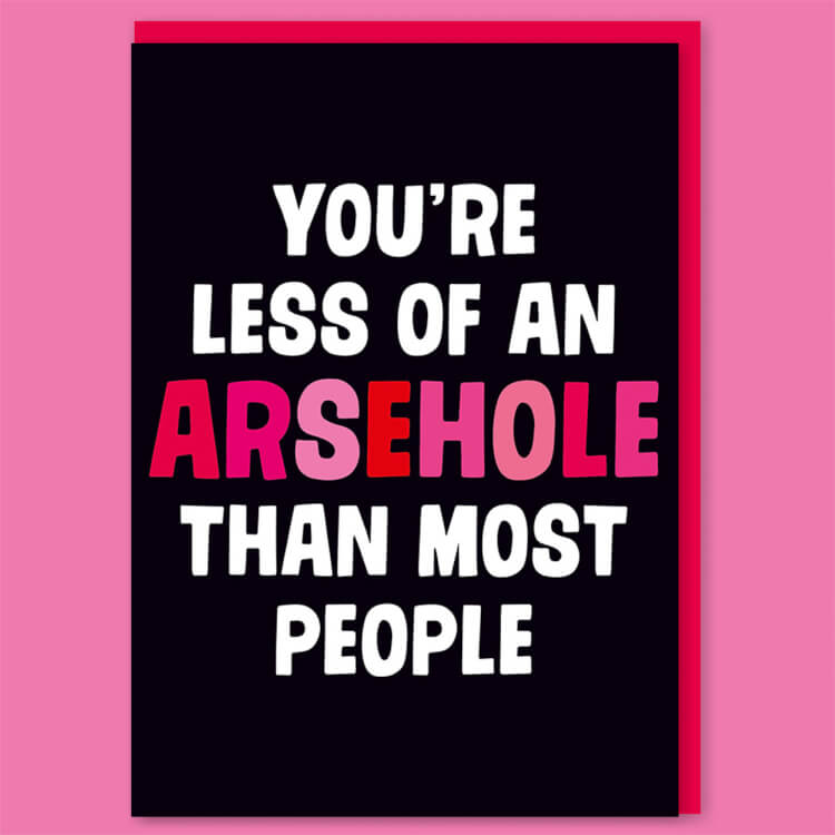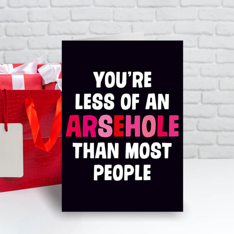 A black card with white text saying you're less of an arsehole than most people with arsehole being in red