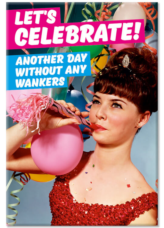 A fridge magnet with a picture of a woman surrounded by balloons and party streamers. Text above her in pink and blue boxes reads Let's celebrate another day without wankers.