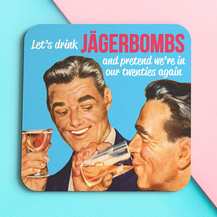 A coaster with a retro-style photo of two men in front of a blue background, drinking alcohol with the words ‘Let’s drink Jägerbombs and pretend we’re in our twenties again’ at the top. ‘Jägerbombs ’ is in big, capitalised pink font and the rest of the sentence is in lower case, white handwriting style font.