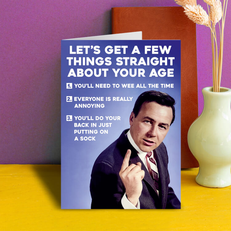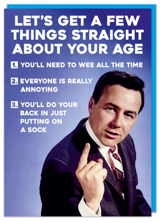 A funny birthday card with a retro photo of a serious looking man pointing and looking to camera. White text above and beside him reads Let's get a few things straight about your age 1. You'll need to wee all the time 2. Everyone is really annoying 3. You'll do your back in just putting on a sock.