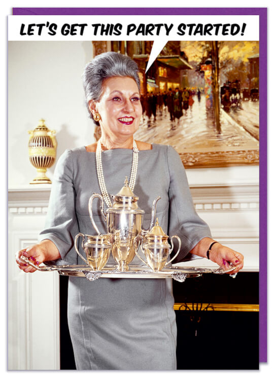 A retro photo of an elderly woman in a gray dress and pearls holding a tray of silverware. Smiling, she says Let's get this party started.