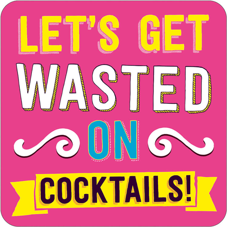 A bright pink coaster with the words ‘Let’s get wasted on cocktails!’ in yellow, white and blue 3D, doodling style font and ‘cocktails!’ against a yellow banner. There are decorative squiggles either side of ‘on’.