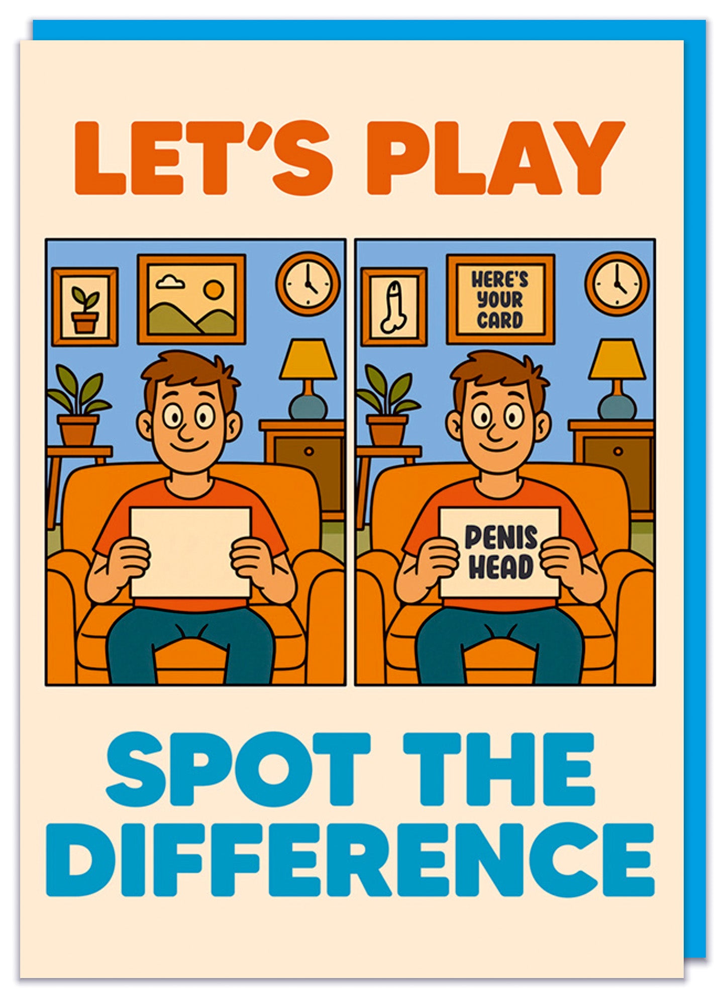 A funny illustrated birthday card based on spot the difference. In the one picture the differences are a man holding a placard that reads penis head and there's a drawing of a comical penis on the wall.