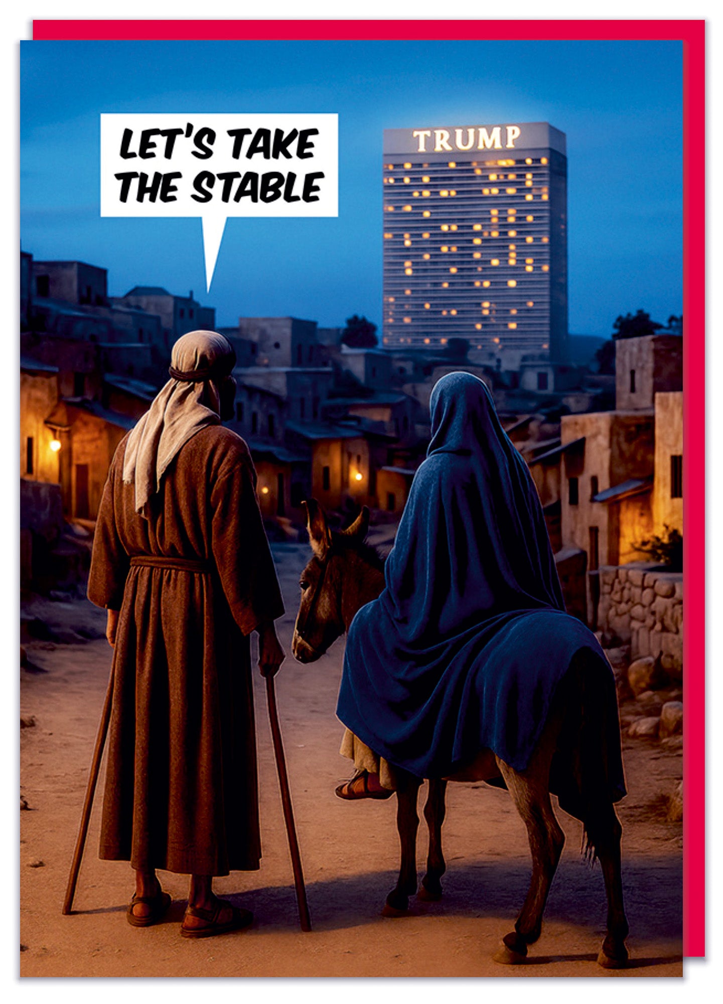 A funny Christmas card featuring a picture of Joseph and Mary arriving into Bethlehem at night with a Trump hotel lit up in the distance. Joseph says Let's take the stable.