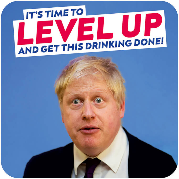 A coaster with a picture of a confused Boris Johnson with text above in a white box reading It's time to level up and get this drinking done.