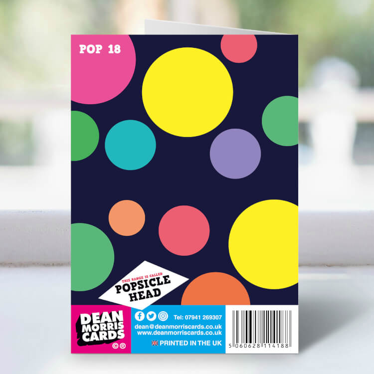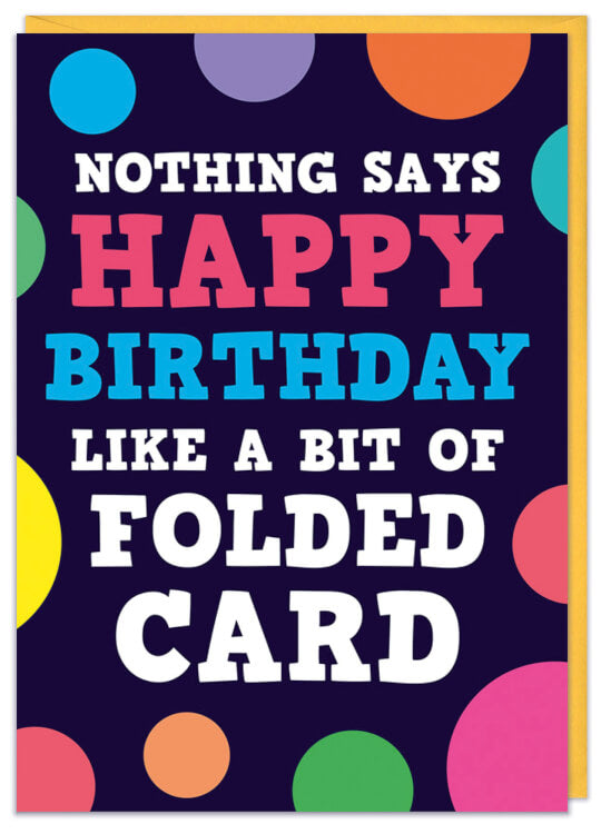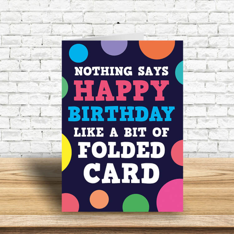 A white birthday card edged by multicoloured circles. White, red and blue in the middle reads Nothing says happy birthday like a piece of folded card.