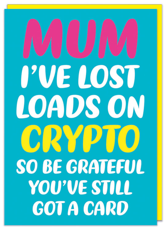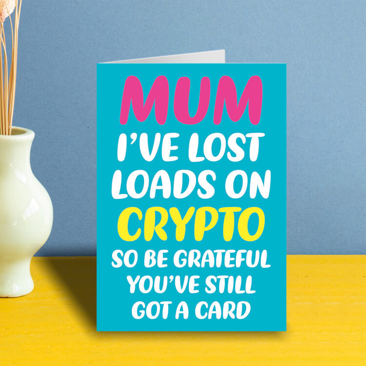 A light blue Mother's Day card with rounded white, pink and yellow text in the middle that reads Mum I've lost loads on crypto so be grateful you've still got a card.